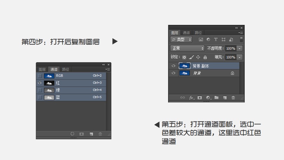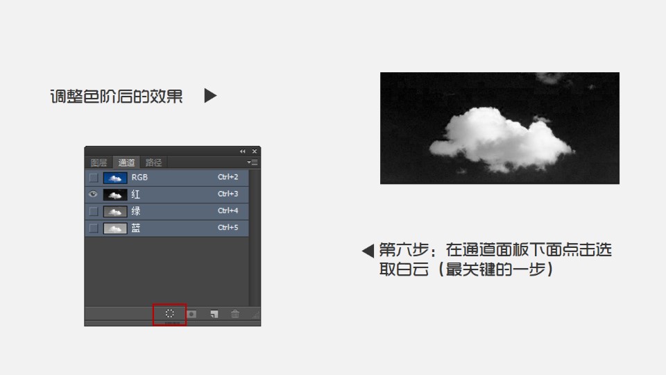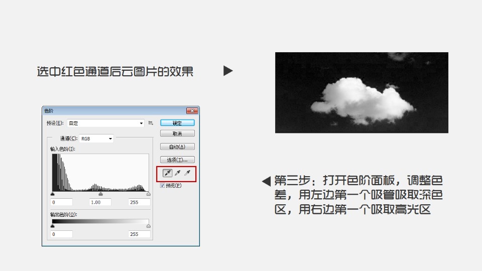 :PowerPoint边缘软件使用技巧二:用PS六步获取白云素材,第一步:在百度中获取相应图片;第二步:用PS打开网上获取的图片,选中红色通道后云图片的效果;第三步:打开色阶面板,调整色差,用左边第一个吸管吸取深色区,用右边第一个吸取高光区;第四步:打开后复制图层;第五步:打开通道面板,选中一色差较大的通道,这里选中红色通道,调整色阶后的效果;第六步:在通道面板下面点击选取白云(最关键的一步),选中白云后的效果;第七步:拷贝到新的图层,新图层为透明色,新建图层并给新的背景色,得到最终效果,关闭其他图层另存为PNG格式。