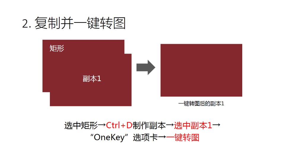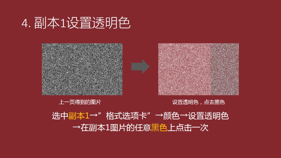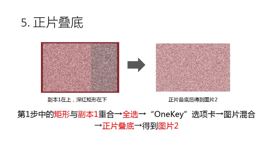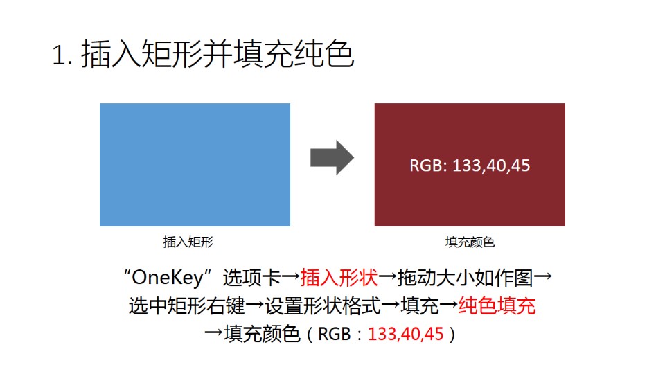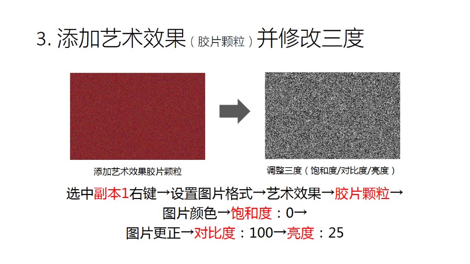 导读:1. 插入矩形并填充纯色:“OneKey”选项卡→插入形状→拖动大小如作图→选中矩形右键→设置形状格式→填充→纯色填充→填充颜色(RGB:133,40,45);2. 复制并一键转图:选中矩形→Ctrl+D制作副本→选中副本1→“OneKey”选项卡→一键转图;3. 添加艺术效果(胶片颗粒)并修改三度:选中副本1右键→设置图片格式→艺术效果→胶片颗粒→图片颜色→饱和度:0→图片更正→对比度:100→亮度:25;4. 副本1设置透明色:选中副本1→”格式选项卡”→颜色→设置透明色→在副本1图片的任意黑色上点击一次。