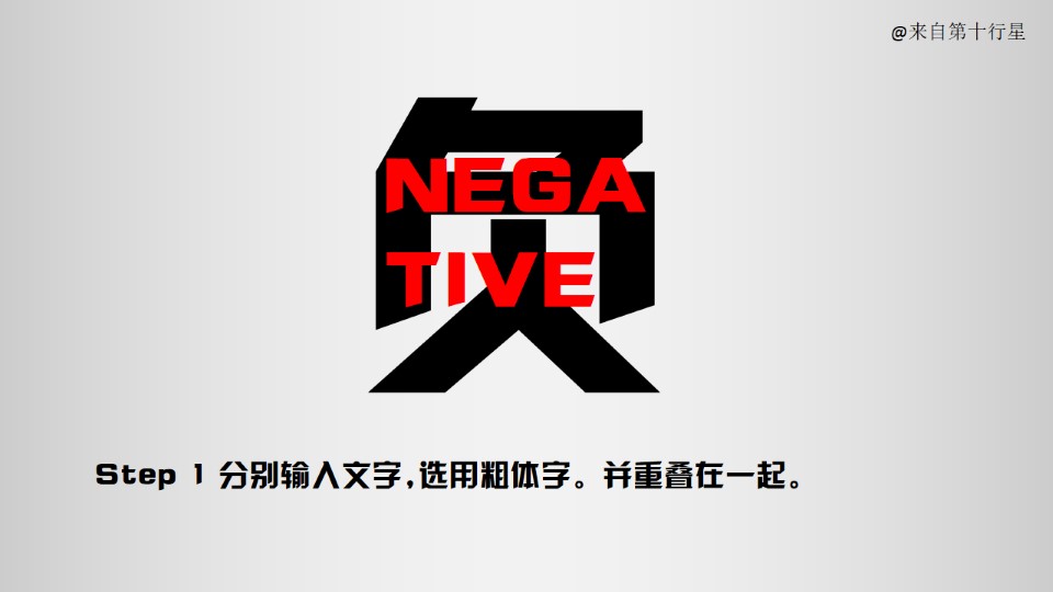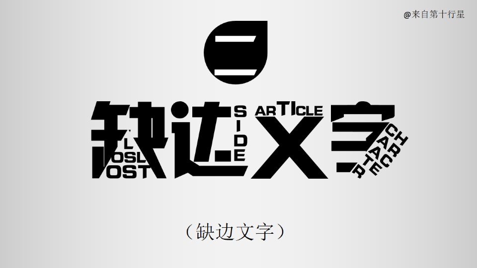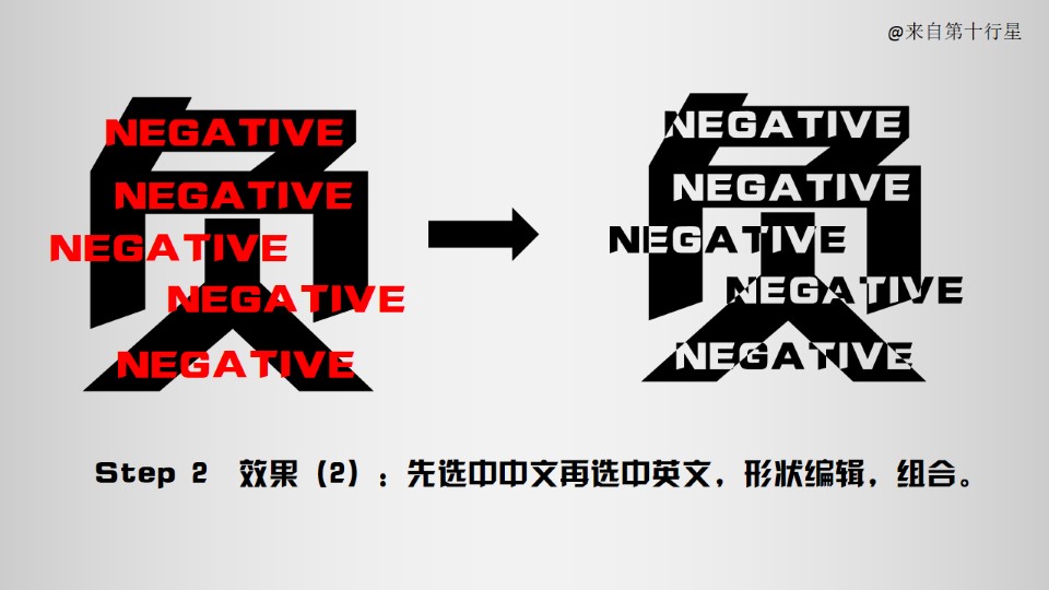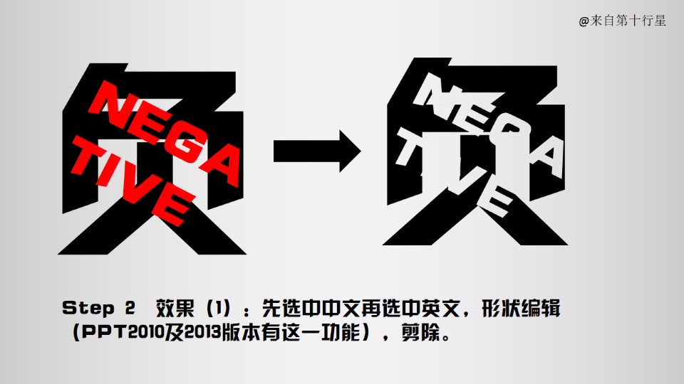 :负空间文字,Step 1 分别输入文字,选用粗体字。并重叠在一起;Step 2 效果(1):先选中中文再选中英文,形状编辑(PPT2010及2013版本有这一功能),剪除;Step 2 效果(2):先选中中文再选中英文,形状编辑,组合;缺边文字,Step 1 输入文字,选用粗体字;Step 2 插入矩形,遮住“半”字的一边;Step 3 先选中文字,后选中矩形,形状编辑>剪除。