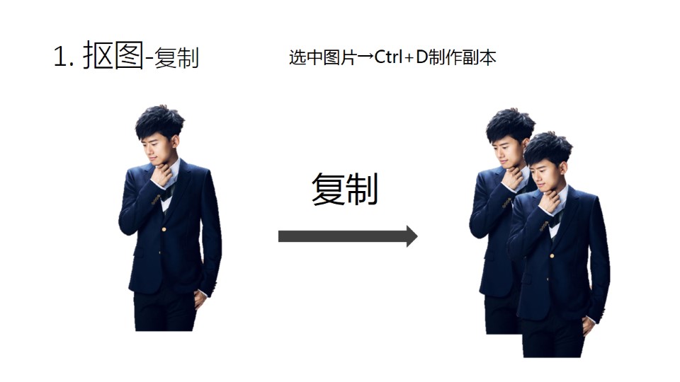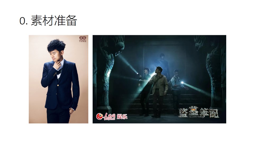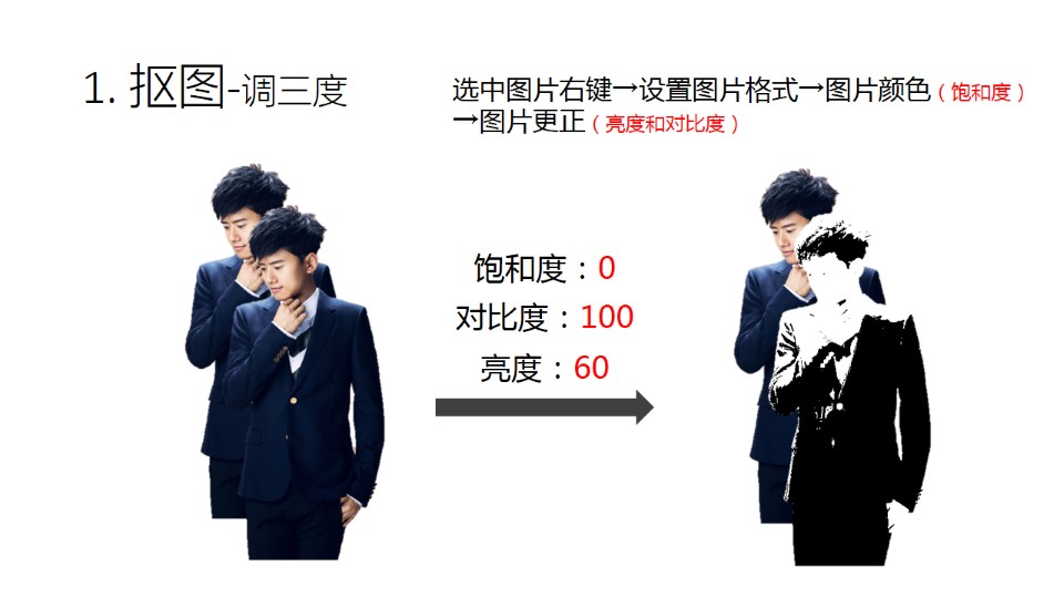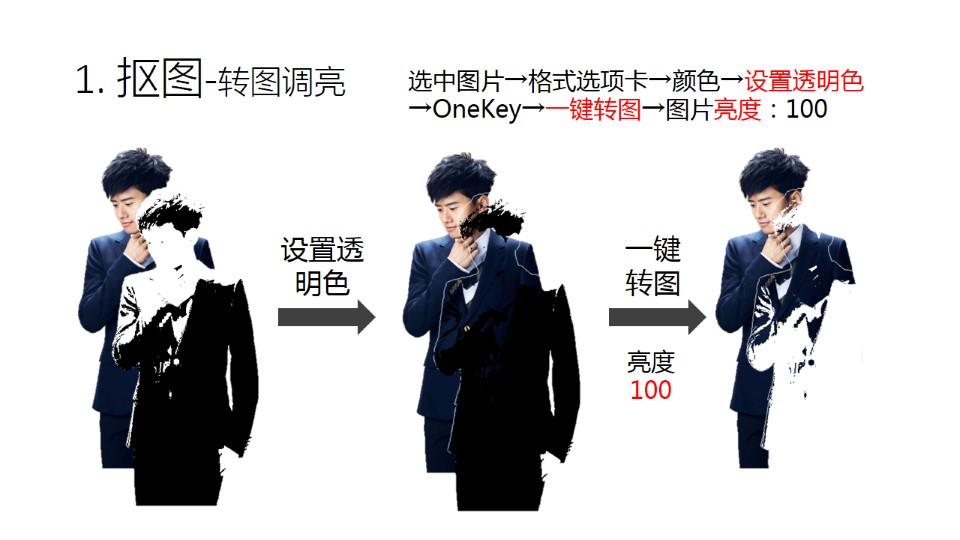 :图片交融术,0. 素材准备,1. 抠图-删除背景,选中图片→格式选项卡→删除背景,1. 抠图-复制,选中图片→Ctrl+D制作副本,1. 抠图-调三度,选中图片右键→设置图片格式→图片颜色(饱和度)→图片更正(亮度和对比度),饱和度:0,对比度:100,亮度:60,1. 抠图-转图调亮,选中图片→格式选项卡→颜色→设置透明色→OneKey→一键转图→图片亮度:100。