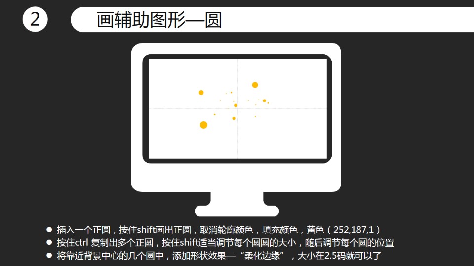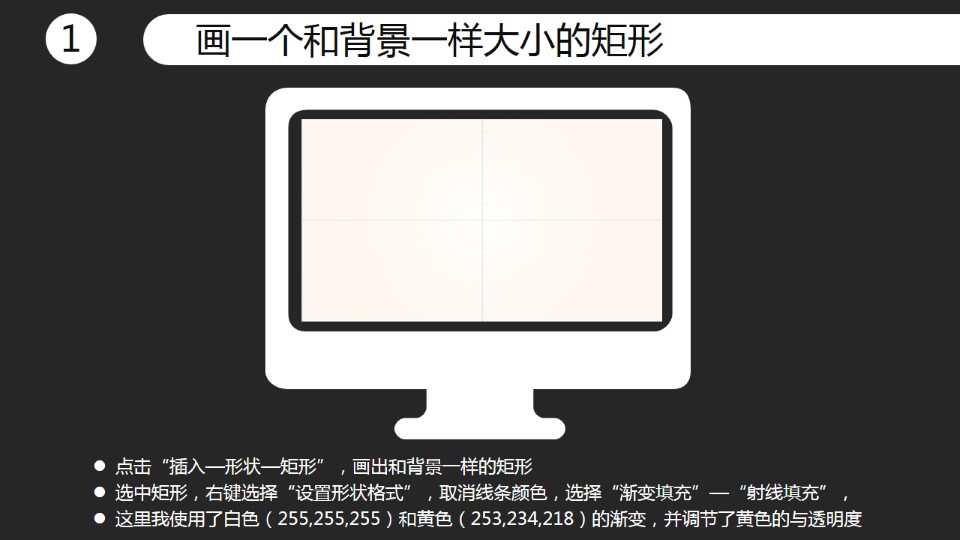 导读:一分钟,PPT首页课堂,1、画一个和背景一样大小的矩形:点击“插入—形状—矩形”,画出和背景一样的矩形;选中矩形,右键选择“设置形状格式”,取消线条颜色,选择“渐变填充”—“射线填充”;这里我使用了白色(255,255,255)和黄色(253,234,218)的渐变,并调节了黄色的与透明度;2、画辅助图形—圆,插入一个正圆,按住shift画出正圆,取消轮廓颜色,填充颜色,黄色(252,187,1),按住ctrl 复制出多个正圆,按住shift适当调节每个圆圆的大小,随后调节每个圆的位置,将靠近背景中心的几个圆中,添加形状效果—“柔化边缘”,大小在2.5码就可以了。