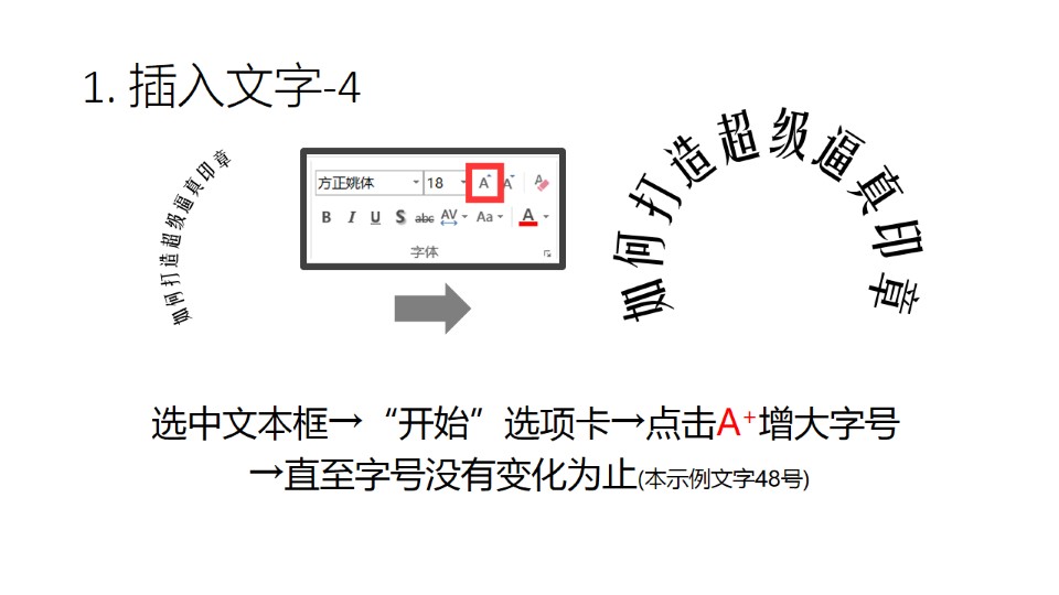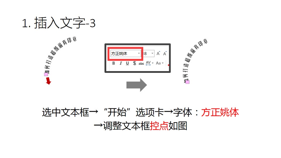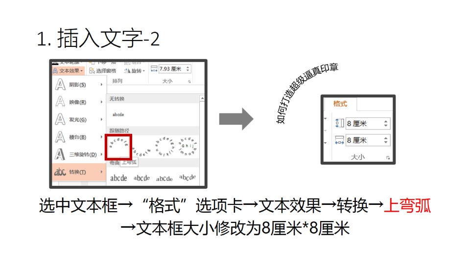 :1. 插入文字:插入选项卡→文本框→横排文本框→输入文字,选中文本框→“格式”选项卡→文本效果→转换→上弯弧 →文本框大小修改为8厘米*8厘米,选中文本框→“开始”选项卡→字体:方正姚体,→调整文本框控点如图,选中文本框→“开始”选项卡→点击A+增大字号→直至字号没有变化为止(本示例文字48号)。