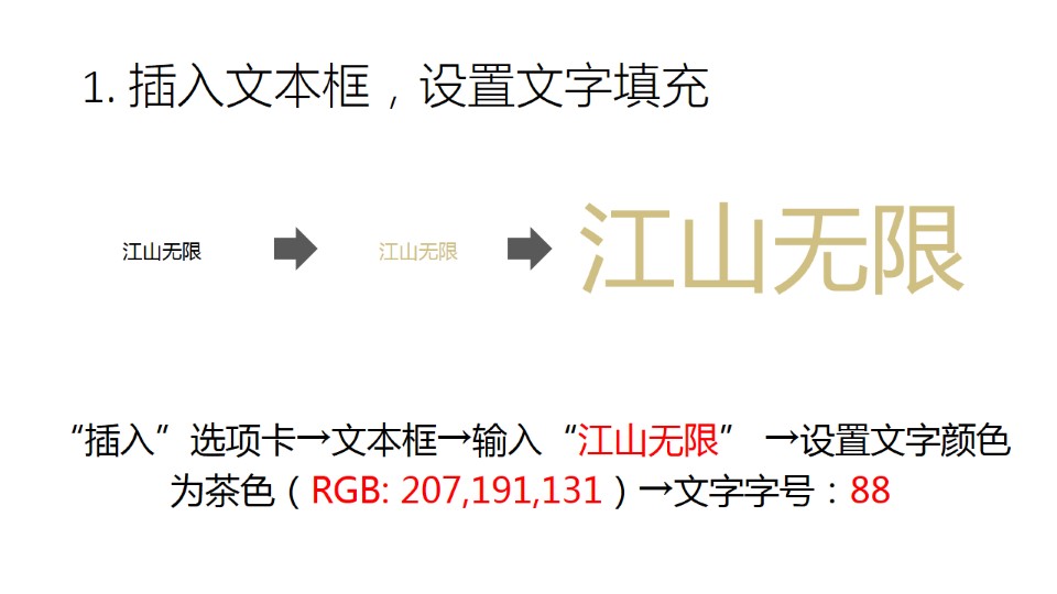 :1. 插入文本框:设置文字填充,“插入”选项卡→文本框→输入“江山无限” →设置文字颜色为茶色(RGB: 207,191,131)→文字字号:88;2. 修改文字字体:修改文字字体,本示例使用“方正字迹-曾正国行楷繁体”;3. 添加文字三维顶部棱台:鼠标置于文本框中右键→设置文字效果格式→三维格式→顶部棱台→宽度和高度都为10磅。