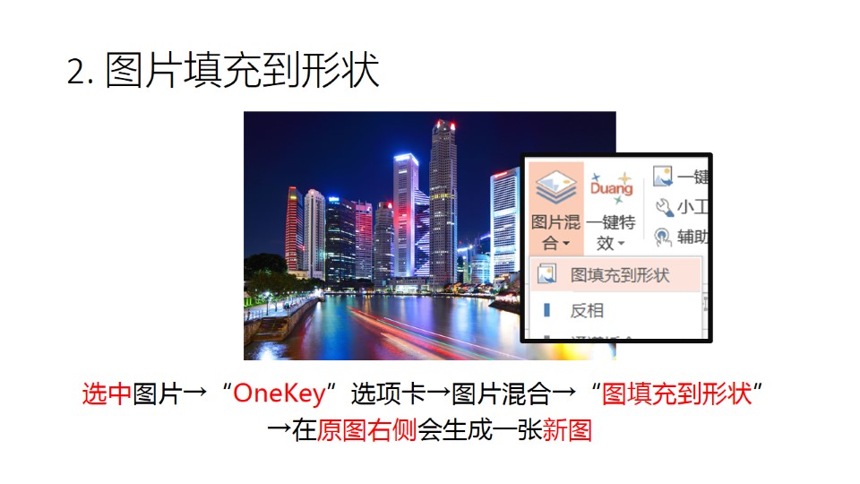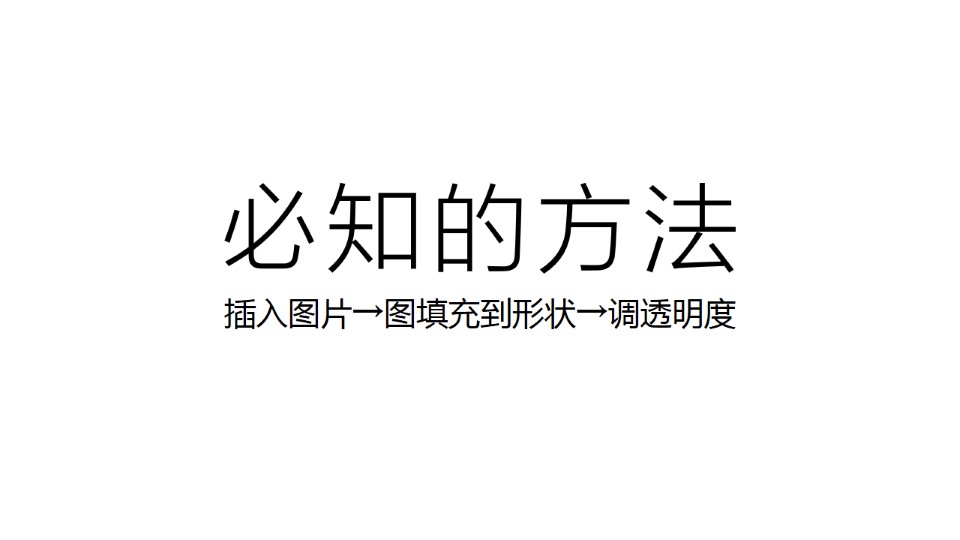 :必知的方法:插入图片→图填充到形状→调透明度;1. 插入一张图:“插入”选项卡→图片→选择图片插入到ppt中;2. 图片填充到形状:选中图片→“OneKey”选项卡→图片混合→“图填充到形状”→在原图右侧会生成一张新图;3. 设置图片透明度:选中新图右键→设置图片格式→图片或纹理填充→透明度:X,PS:具体透明度值需根据实际情况而定,这里重点是知道怎么调透明度即可。