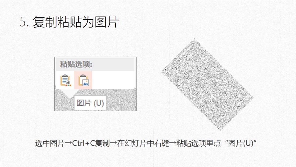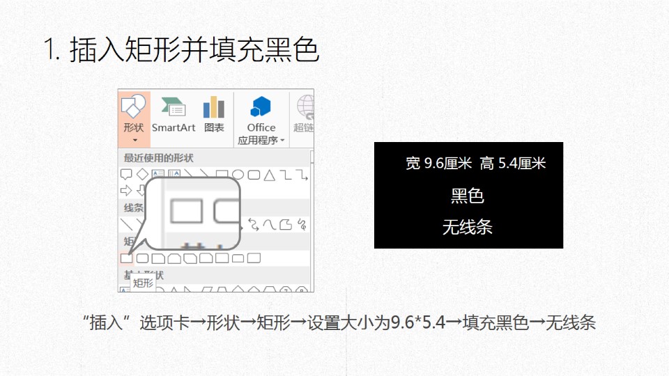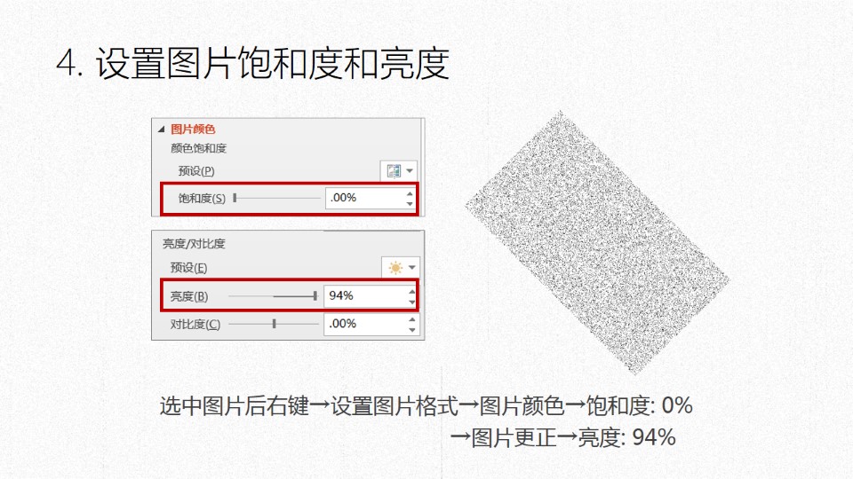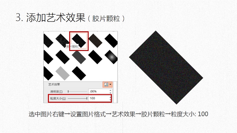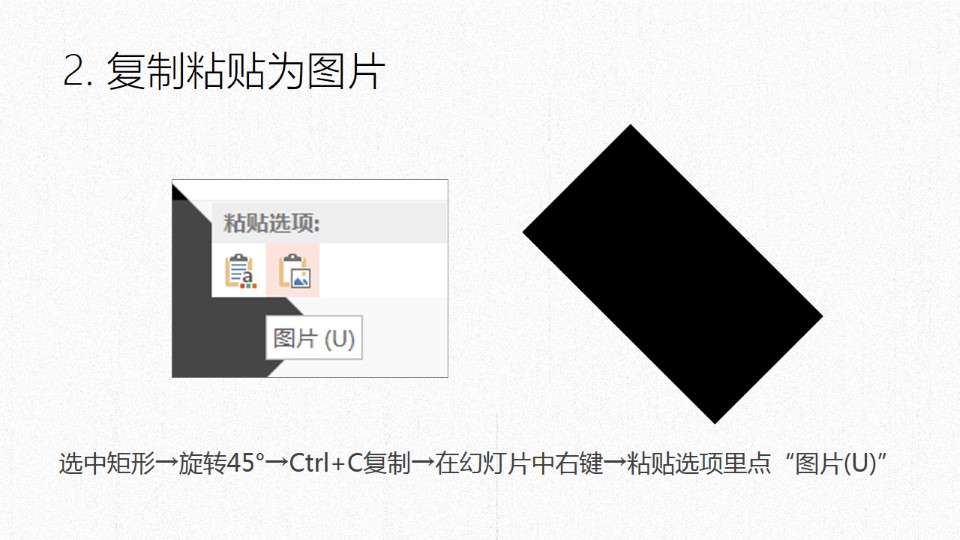 :1. 插入矩形并填充黑色:“插入”选项卡→形状→矩形→设置大小为9.6*5.4→填充黑色→无线条;2. 复制粘贴为图片:选中矩形→旋转45°→Ctrl+C复制→在幻灯片中右键→粘贴选项里点“图片(U)”;3. 添加艺术效果(胶片颗粒):选中图片右键→设置图片格式→艺术效果→胶片颗粒→粒度大小: 100;4. 设置图片饱和度和亮度:选中图片后右键→设置图片格式→图片颜色→饱和度: 0%。