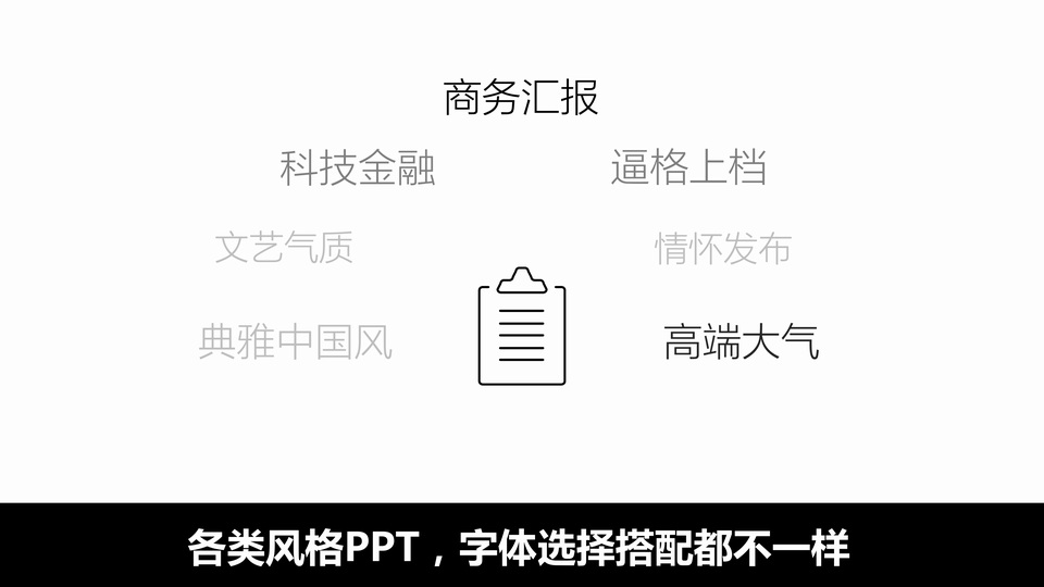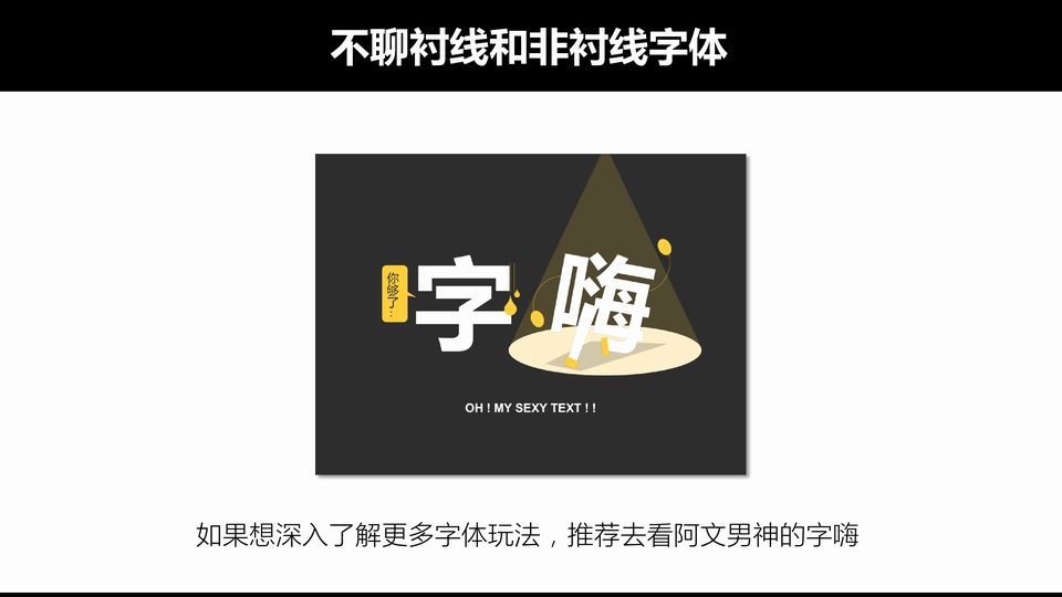 :嘿,PPT系列教程之字体的奥秘,这一期,我们聊聊字 体,只聊字体场景使用和 选字体,不聊衬线和非衬线字体,如果想深入了解更多字体玩法,推荐去看阿文男神的字嗨,各类风格PPT,字体选择搭配都不一样,字体搭配恰当 瞬间提升逼格,抓住视觉眼球。