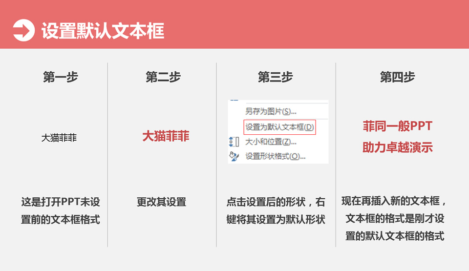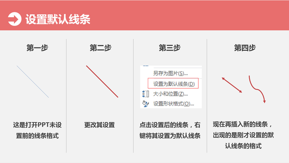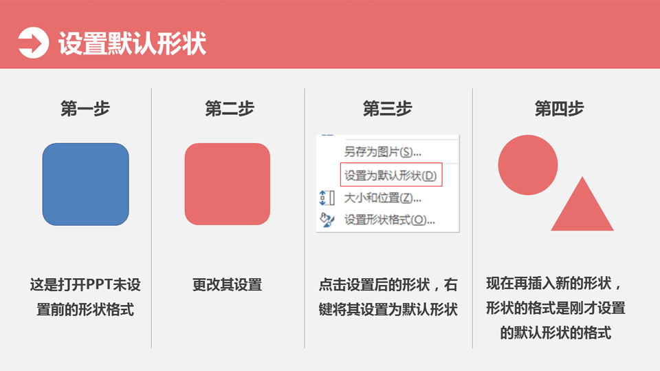 :写在前面,形状、线条、文本框在操作过程中会有同样的格式反复出现,我们除了用格式刷操作,还可以通过设置将最常用的格式设置为默认形状、线条、文本框,设置默认形状,第一步:这是打开的ppt未设;第二步:更改其设置;第三步:点击设置后的形状,右键将其设置为默认形状;第四步:现在再插入新的形状,形状的格式是刚才设置的默认形状的格式。