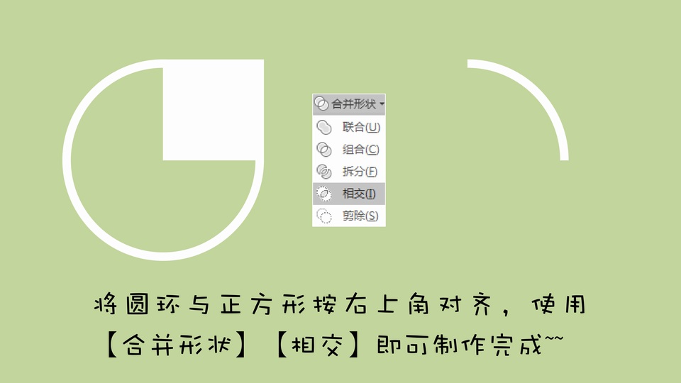 :默呆P事儿,Easy PPT Tricks to Learn ,第五话,扑 面 而 来的 老爷 、 姑奶 奶 们 ,今 天 讲 解的 主 题 是控点,近日,有小伙伴问我,如何绘 制四分之一圆弧~~一个厉害的小伙伴说,这很简单啊, 应该这样做~~~绘制一个直径为d圆环,绘 制一个边长为d/2的正方形 ~~将圆环与正方形按右上角对齐,使用 【合并形状】【相交】即可制作完成~~
