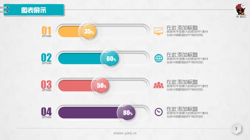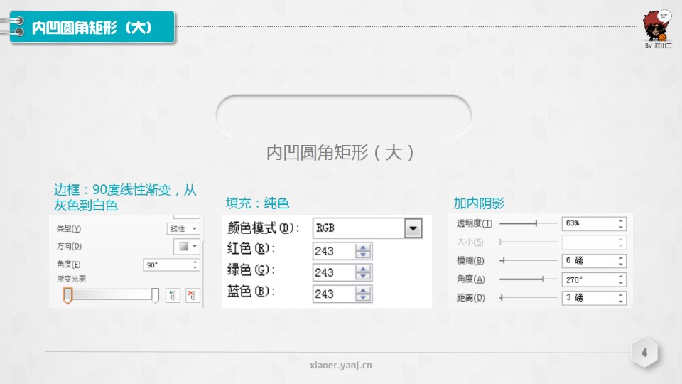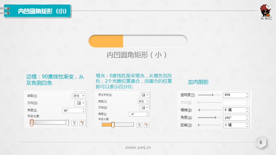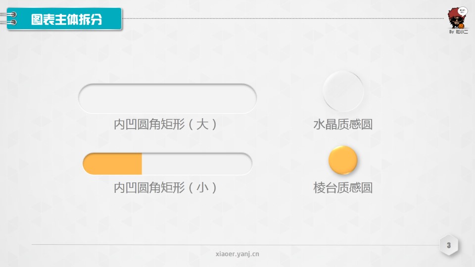 :图表主题拆分,内凹圆角矩形(大),水晶质感圆,内凹圆角矩形(小),棱台质感圆,边框:90度线性渐变,从灰色到白色,填充:纯色,加内阴影,边框:90度线性渐变,从灰色到白色,填充:0度线性渐变填充,从橙色到灰色,2个光圈位置重合,用重合的位置即可以表示百分比,内加阴影。