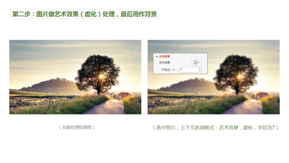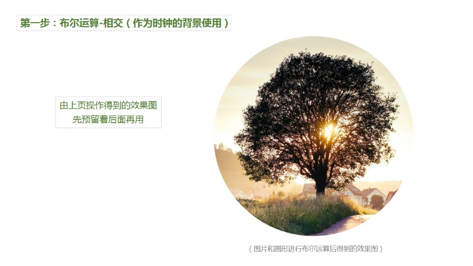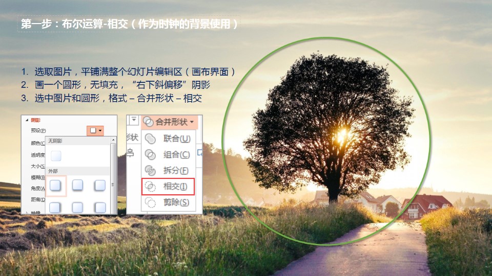 :第一步:布尔运算-相交(作为时钟的背景使用),1、选取图片,平铺满整个幻灯片编辑区(画布界面),2、画一个圆形,无填充,“右下斜偏移”阴影,3、选中图片和圆形,格式 – 合并形状 – 相交,由上页操作得到的效果图,先预留着后面再用,第二步:图片做艺术效果(虚化)处理,最后用作背景,(选中图片,上下文选项格式 - 艺术效果,虚化,半径为7)。