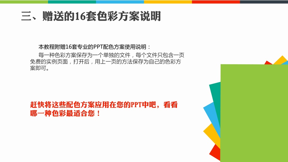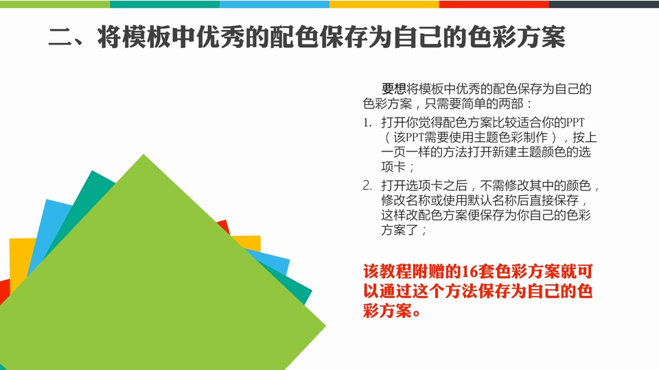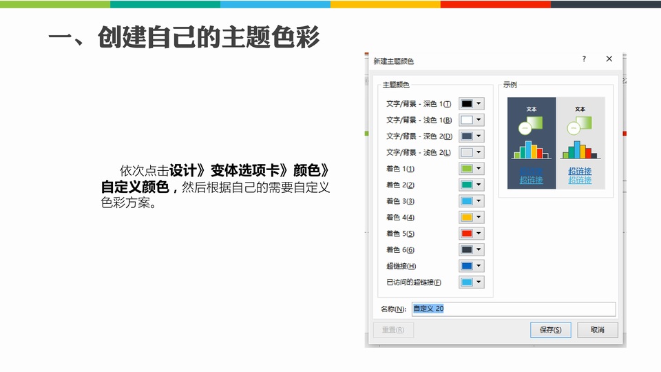 导读:主题色实用技巧(赠送16套全新色彩方案),一、创建自己的主题色彩,依次点击设计》变体选项卡》颜色》自定义颜色,然后根据自己的需要自定义色彩方案;二、将模板中优秀的配色保存为自己的色彩方案,要想将模板中优秀的配色保存为自己的色彩方案,只需要简单的两部:打开你觉得配色方案比较适合你的PPT(该PPT需要使用主题色彩制作),按上一页一样的方法打开新建主题颜色的选项卡;打开选项卡之后,不需修改其中的颜色,修改名称或使用默认名称后直接保存,这样改配色方案便保存为你自己的色彩方案了;