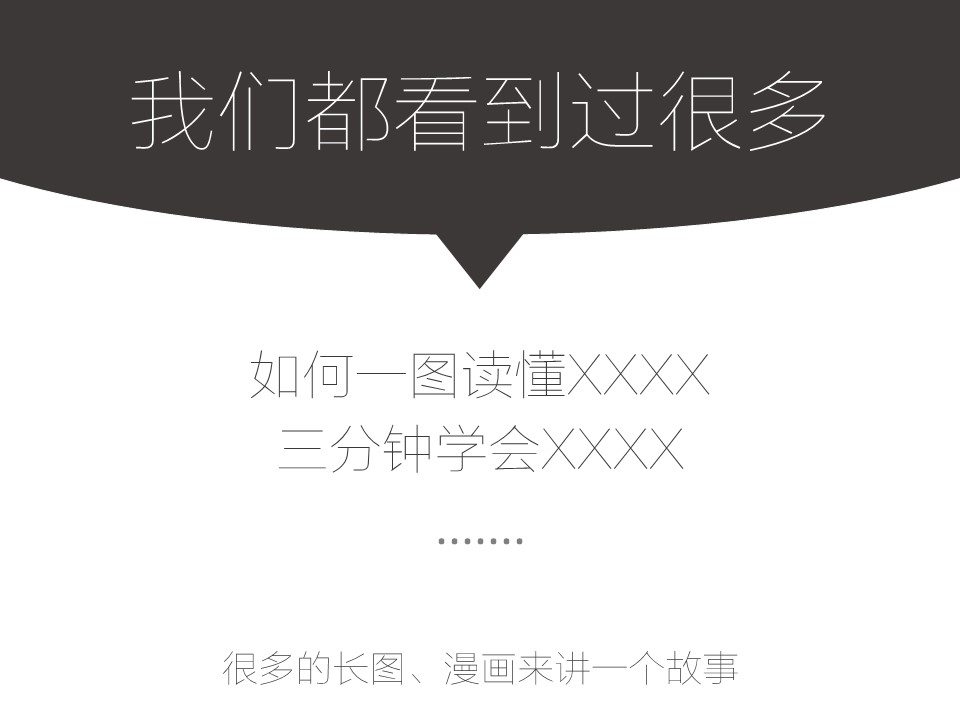 :我们都看到过很多,如何一图读懂XXXX,三分钟学会XXXX,.......很多的长图、漫画来讲一个故事,类似这些,淘宝,顾爷,赛雷,差不多是这样子。