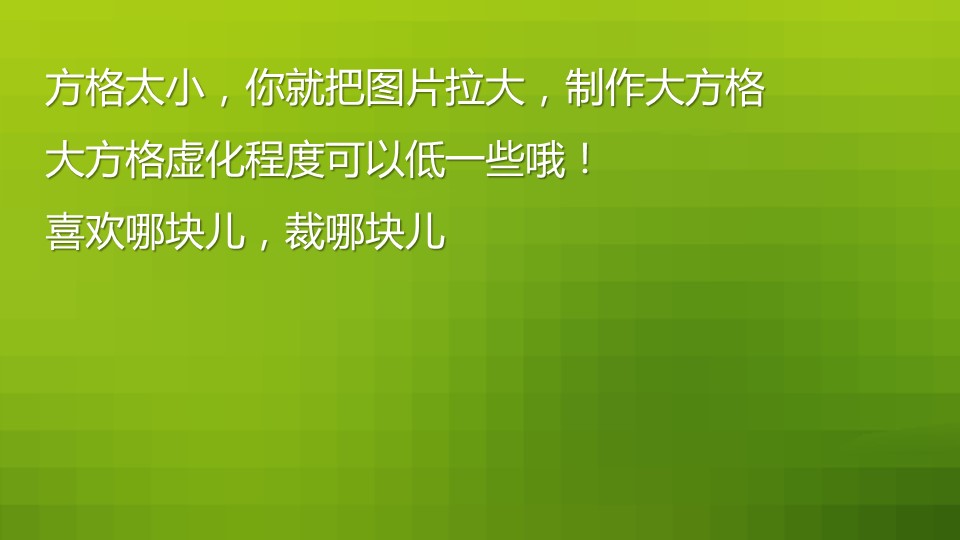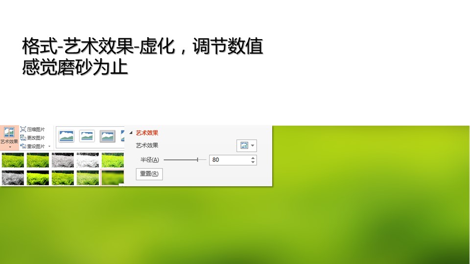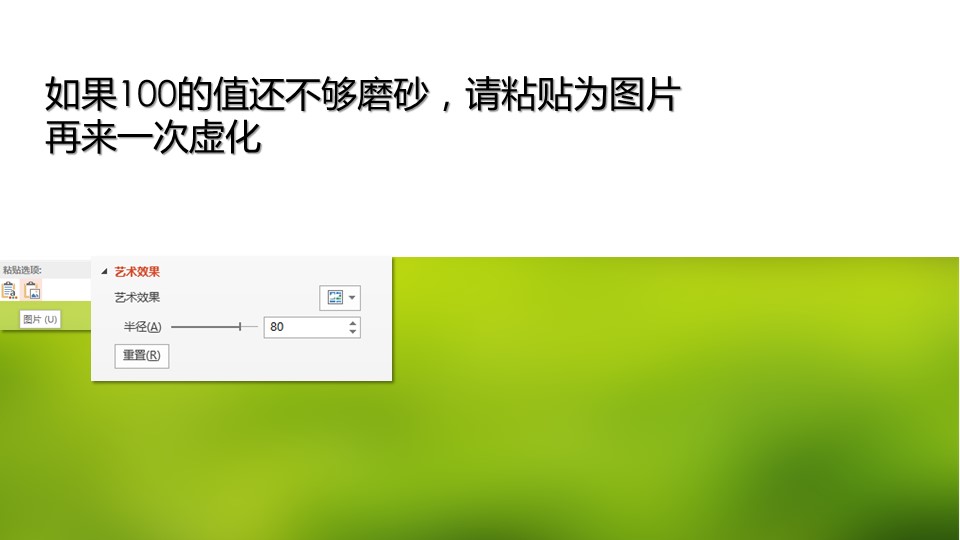 :ios篇懒人,一分钟晶格化背景教程,彦色金辰PPT,爱生活,爱设计,百度关键词:绿色(单色即可),下载图片裁剪好尺寸,格式——艺术效果——虚化,调节数值,感觉磨砂为止,如果100的值还不够磨砂,请粘贴为图片,再来一次虚化。