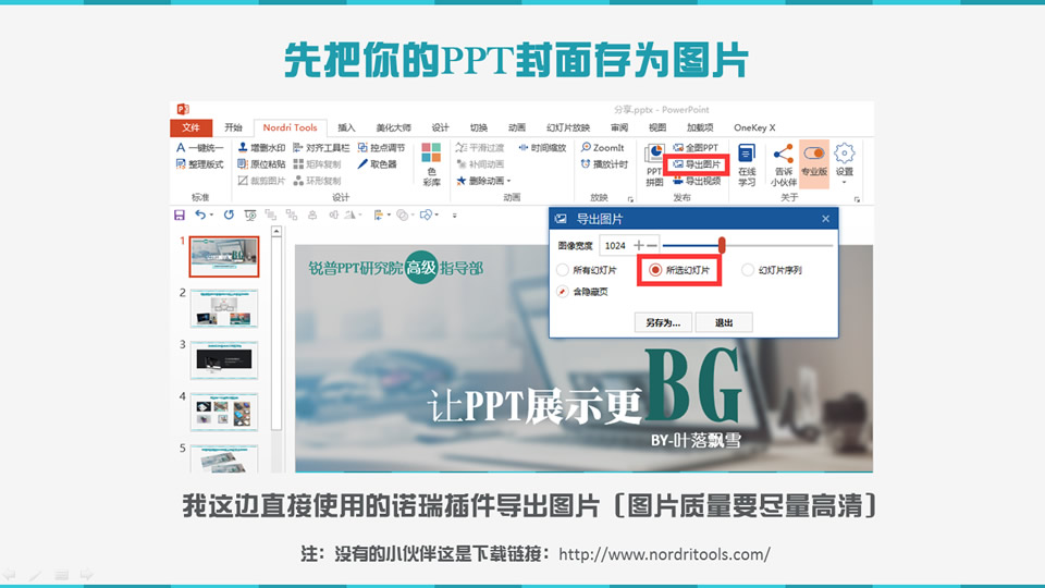 :三维透视及三维旋转的妙用,我们看到的大多数的PPT展示大多是这样的这些创意大多来自于网页宣传,直到有一天在网上看到些,让我想到我们PPT的展示也是可以这样的,先把你的PPT封面存为图片,我这边直接使用的诺瑞插件导出图片(图片质量要尽量高清)插入封面图片调整到合适大小,选中图片设置图片的格式。