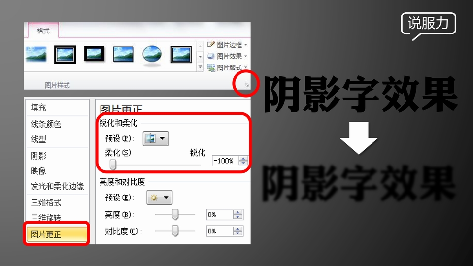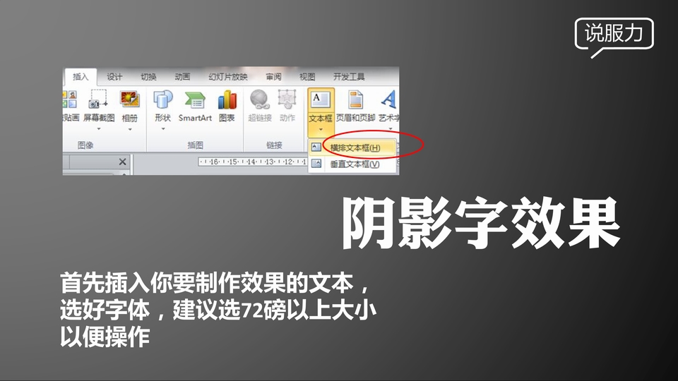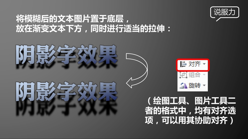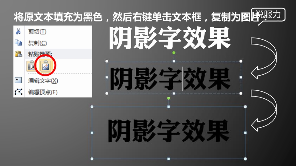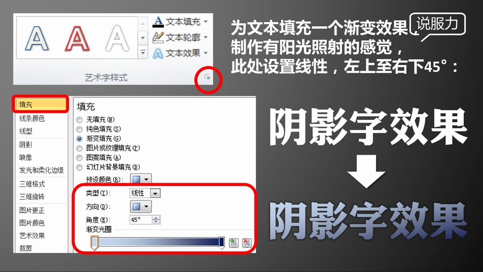 :阴影字效果:首先插入你要制作效果的文本,选好字体,建议选72磅以上大小,以便操作,为文本填充一个渐变效果,制作有阳光照射的感觉,此处设置线性,左上至右下45°:阴影字效果,阴影字效果,将原文本填充为黑色,然后右键单击文本框,复制为图片。