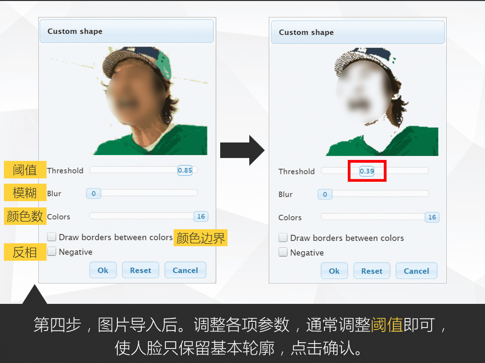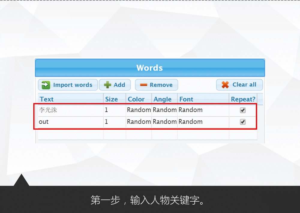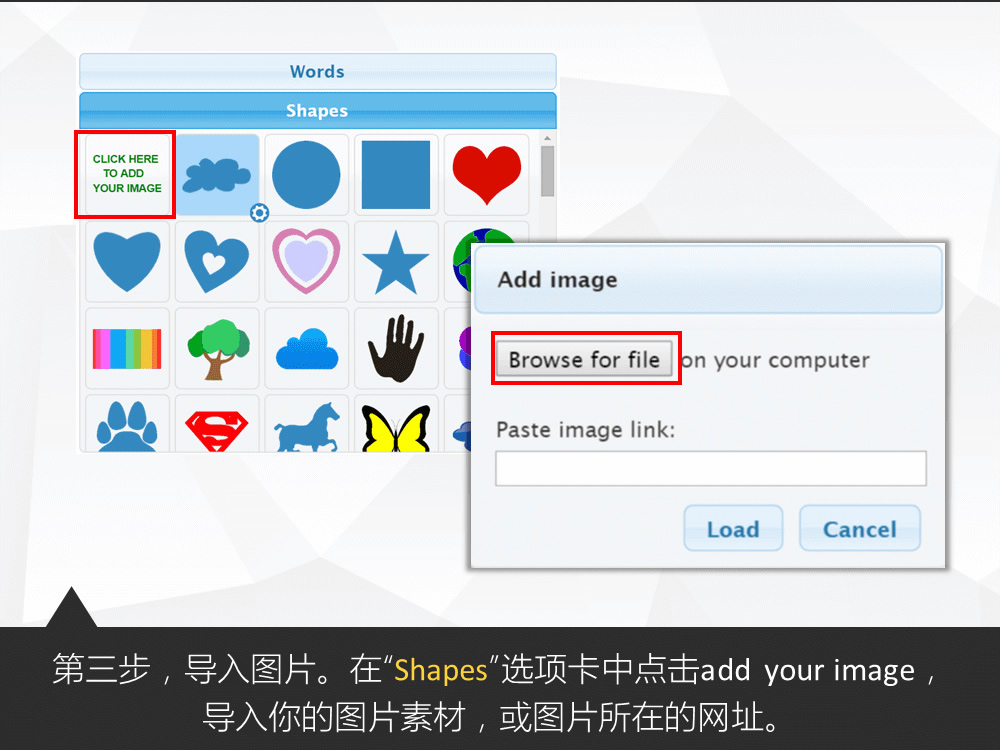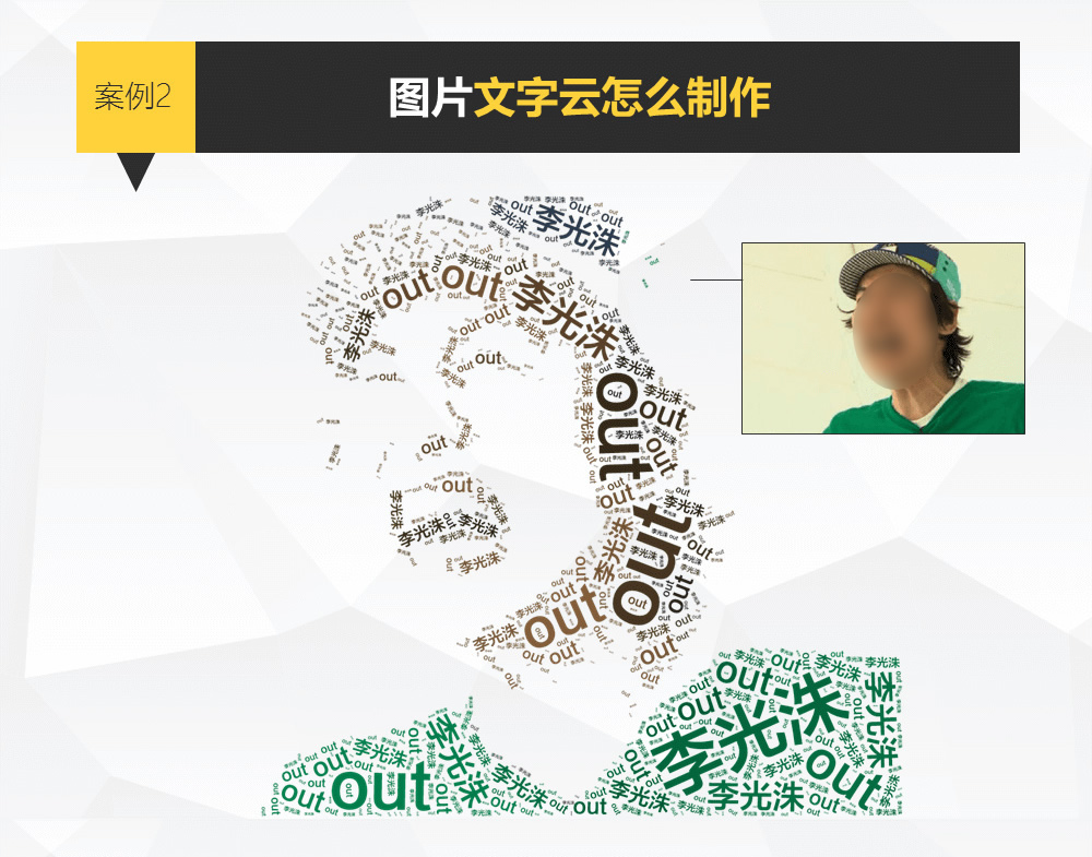 :1文字云制作全攻略(二),案例2:图片文字云怎么制作,第一步:输入人物关键字,第二步:准备一张图片素材,背景越空白越好,第三步:导入图片,在“shapes”选项卡中点击add you images,导入你的图片素材,或图片所在的网址,第四步:图片导入后,调整各项参数,通常调阈值即可,使人脸只保留基本轮廓,点击确认。