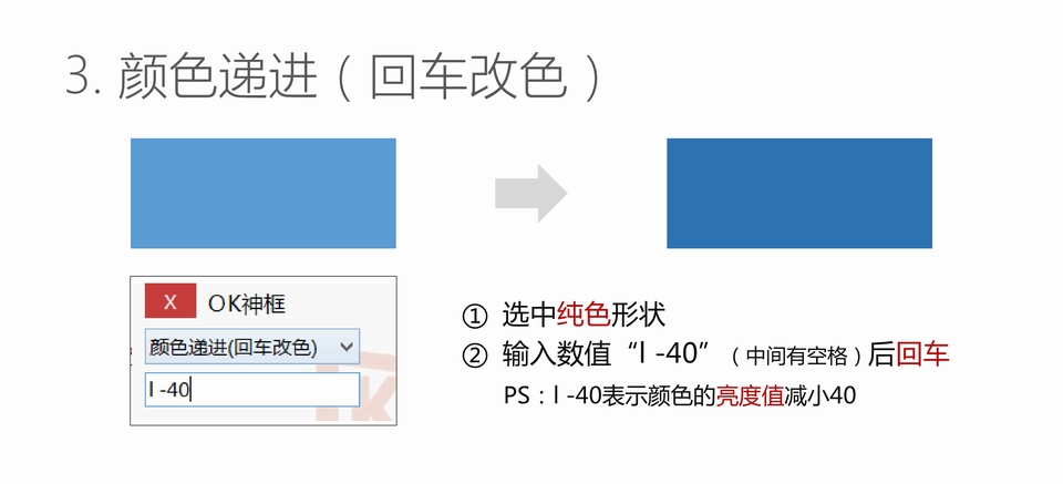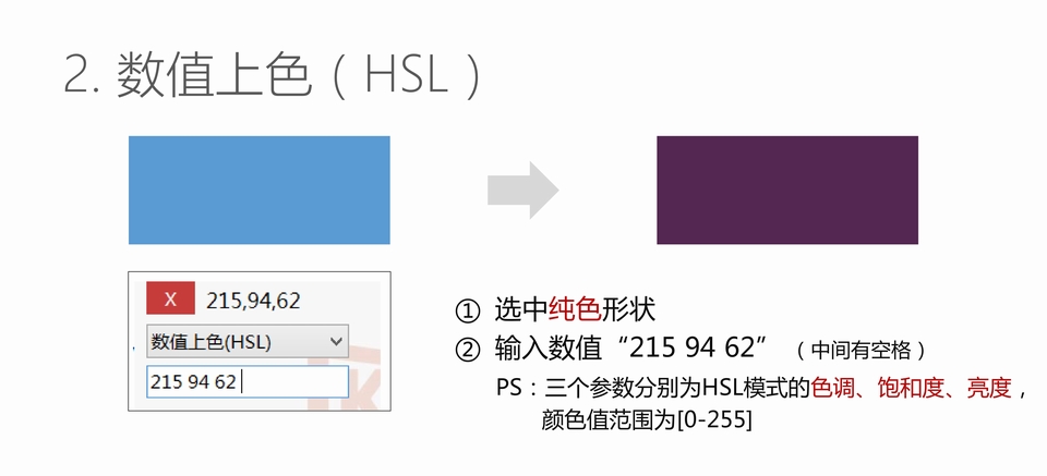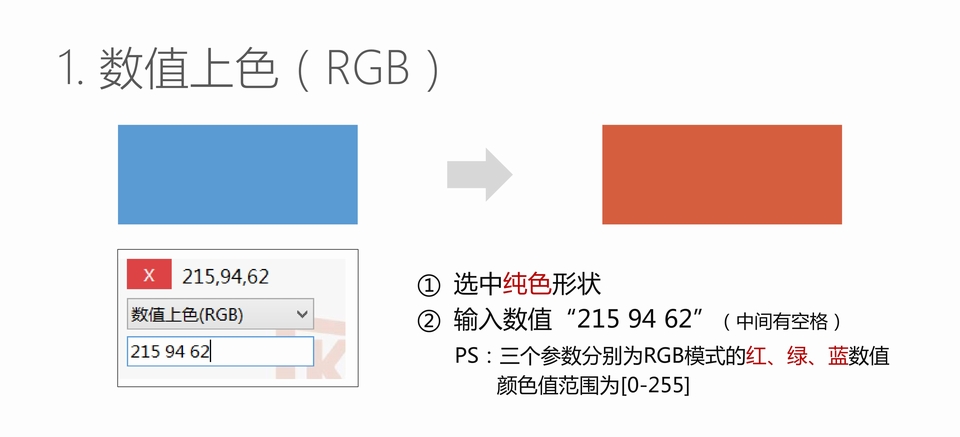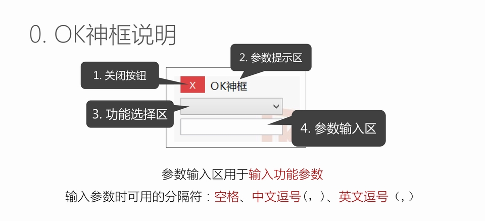 导读:OneKeyTools,OK神框,0. OK神框说明,参数输入区用于输入功能参数,输入参数时可用的分隔符:空格、中文逗号(,)、英文逗号(,)1. 数值上色(RGB),选中纯色形状,输入数值“215 94 62”(中间有空格),PS:三个参数分别为RGB模式的红、绿、蓝数值,颜色值范围为[0-255],2. 数值上色(HSL)选中纯色形状,输入数值“215 94 62” (中间有空格),PS:三个参数分别为HSL模式的色调、饱和度、亮度,颜色值范围为[0-255]。