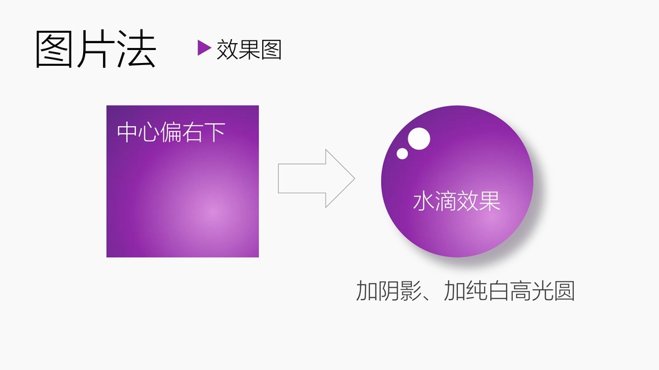 :图片法:填充射线渐变,复制粘贴为图片,裁剪图片,效果图,加阴影、加纯白高光圆,补位法:绘制一大一小两个形状,组合起来给组合填充射线渐变,Alt+F10调出选择窗口,隐藏较大的矩形,移动小矩形的位置,效果图,还是以水滴为例,给小圆加阴影、加纯白高光圆,旋转法:绘制一个菱形,填充射线渐变,菱形旋转45°,效果图,绘制一个矩形,填充射线渐变,复制该矩形,修改渐变方向为从左下角,将两个矩形拼合起来。