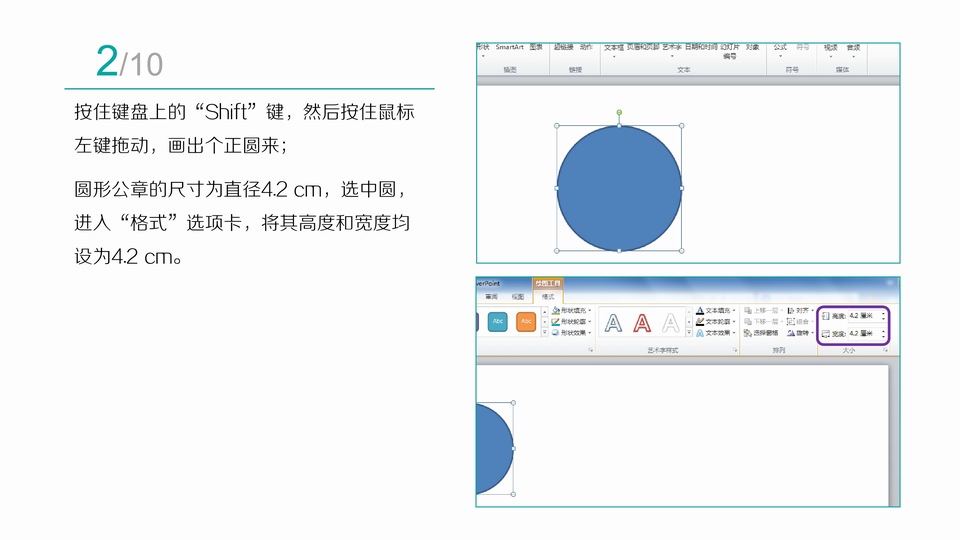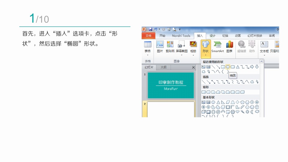 :印章制作教程,MoreFun+,首先,进入“插入”选项卡,点击“形状”,然后选择“椭圆”形状;按住键盘上的“Shift”键,然后按住鼠标左键拖动,画出个正圆来;圆形公章的尺寸为直径4.2 cm,选中圆,进入“格式”选项卡,将其高度和宽度均设为4.2 cm;选中圆,然后将“形状填充”设为“无填充颜色”,将“形状轮廓”设为“红色”,再设置粗细为“6磅(其他值也行,看上去差不多就行)”。