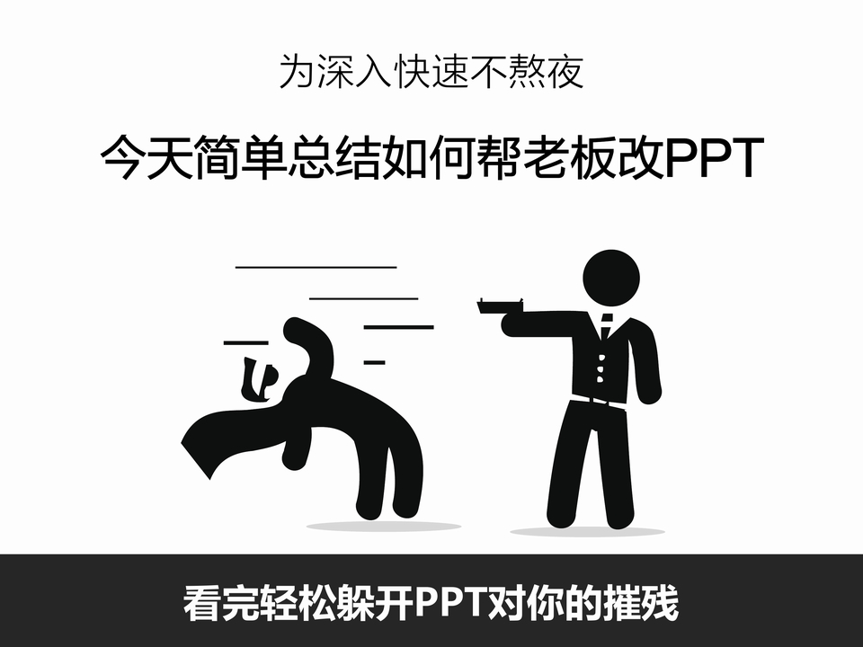 :为深入快速不熬夜,今天简单总结如何帮老板改PPT,看完轻松躲开PPT对你的摧残,《嘿!PPT》系列教程,分分钟交稿,绝对不熬夜。