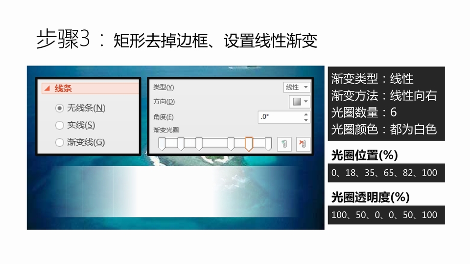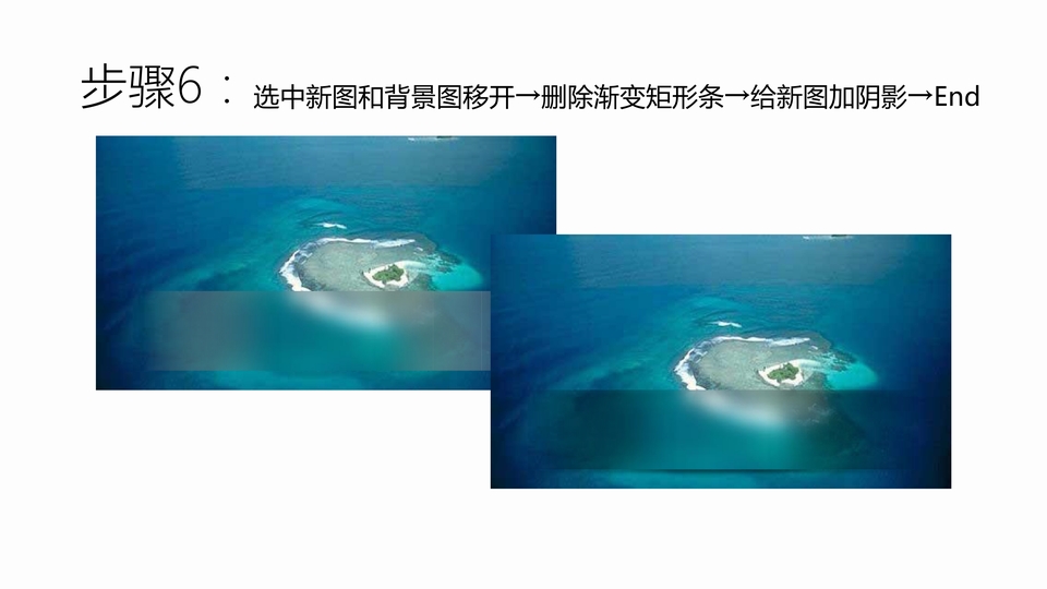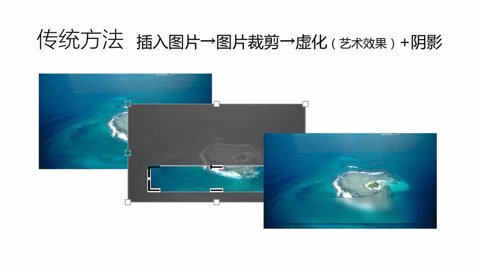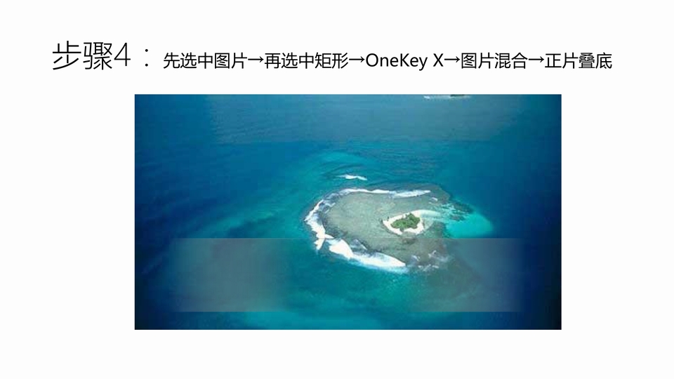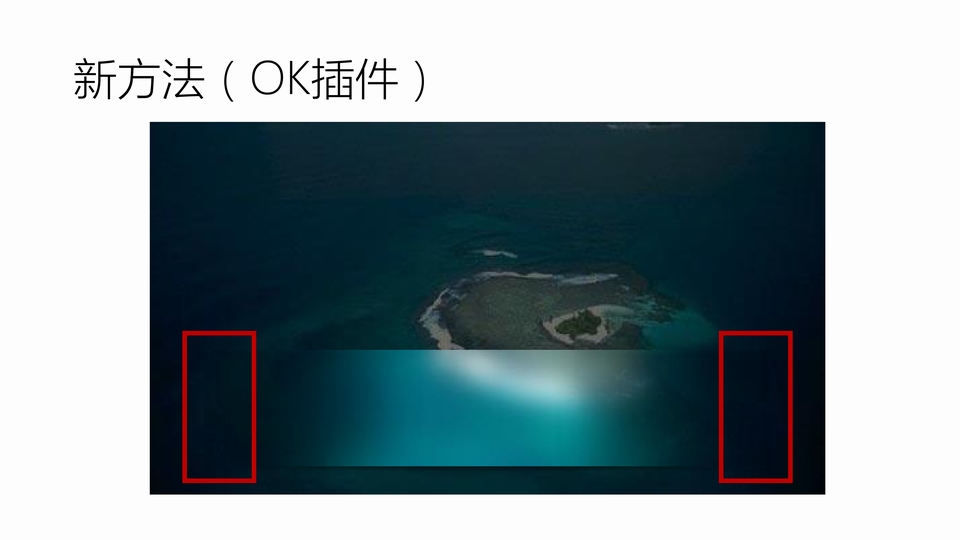 :边缘过渡毛玻璃做法,传统方法:插入图片→图片裁剪→虚化(艺术效果)+阴影,方法缺陷:左右两侧太过粗暴,与背景融合欠缺,新方法(OK插件)步骤1:插入图片,步骤2:插入矩形,步骤3:矩形去掉边框、设置线性渐变,步骤4:先选中图片→再选中矩形→OneKey X→图片混合→正片叠底,步骤5:选中新图右键→设置图片格式→艺术效果→虚化→半径22,步骤6:选中新图和背景图移开→删除渐变矩形条→给新图加阴影→End。