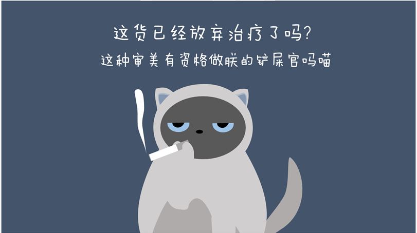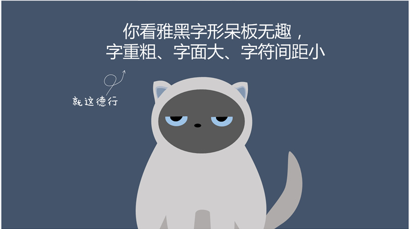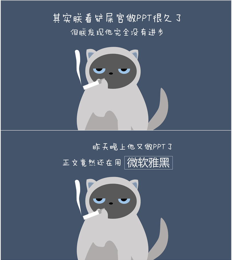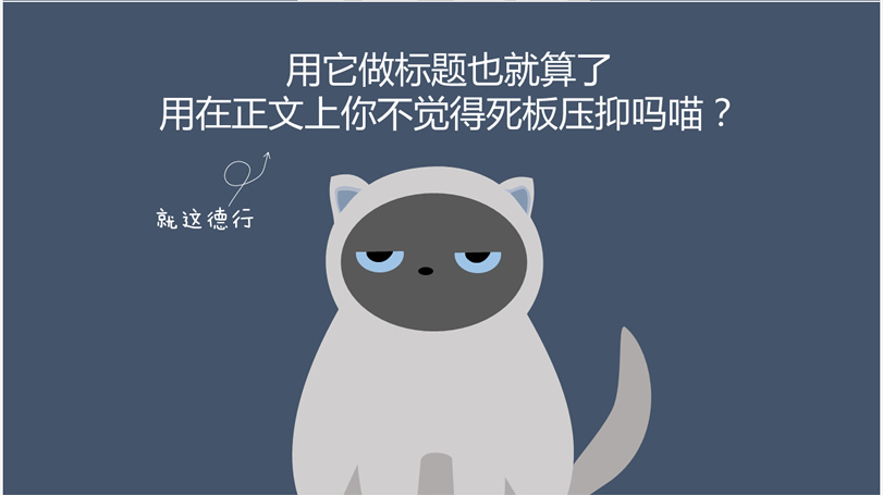 :连喵星人都知道正文不能用雅黑,其实朕看铲屎官做ppt很久了,但朕发现他完全没有进步,昨天晚上他又做ppt了,正文竟然还在用微软雅黑,这货已经放弃治疗了吗?这种审美有资格做朕的铲屎官吗喵。