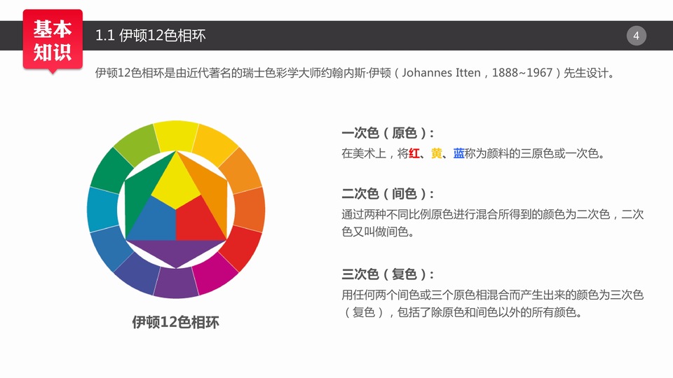导读:基本知识:1.1 伊顿12色相环;1.2 色光三原色 & 色料三原色;1.3 HSL;1.4 色彩冷暖;1.5 常见色彩搭配;1.6 无色彩 & 有色彩,用色要点;2.1 基本用色原则;2.2 整体风格色;2.3 母版背景色;2.4 母版标题栏色;2.5 文字色