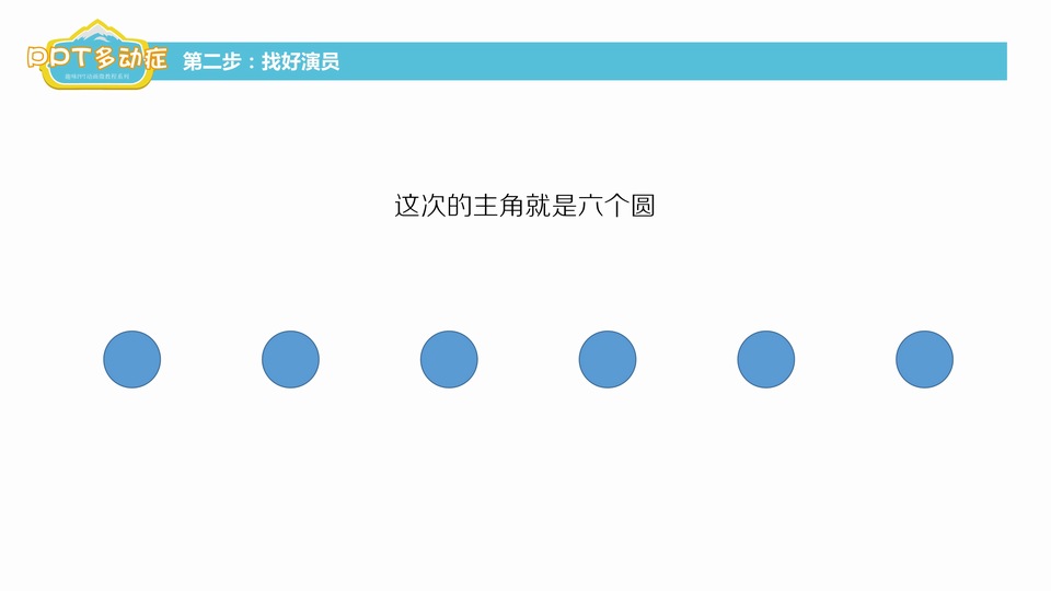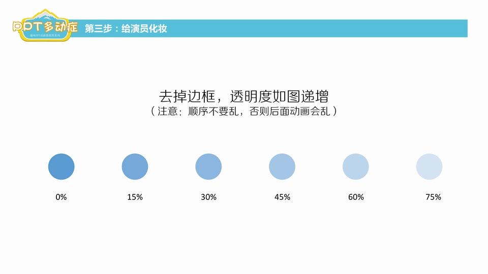 :PPT多动症,趣味PPT动画微教程系列,有趣的loading动画制作效果,第一步:动画制作原理与步骤;做动画就好像导演一场话剧,画布是“舞台”素材是“演员”,时间轴就是“剧本”;第二步:找好演员,这次的主角就是六个圆;第三步:给演员化妆;去掉边框,透明度如图递增(注意:顺序不要乱,否则后面动画会乱)。