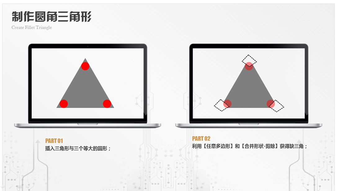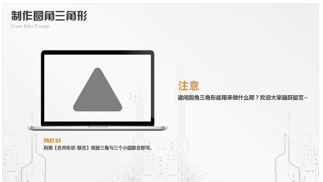 :制作圆角三角形,PART 01 :插入三角形与三个等大的圆形;PART 02 :利用【任意多边形】和【合并形状-剪除】获得缺三角;PART 03 :利用【合并形状-联合】将缺三角与三个小圆联合即可,注意:请问圆角三角形能用来做什么呢?欢迎大家踊跃留言~。