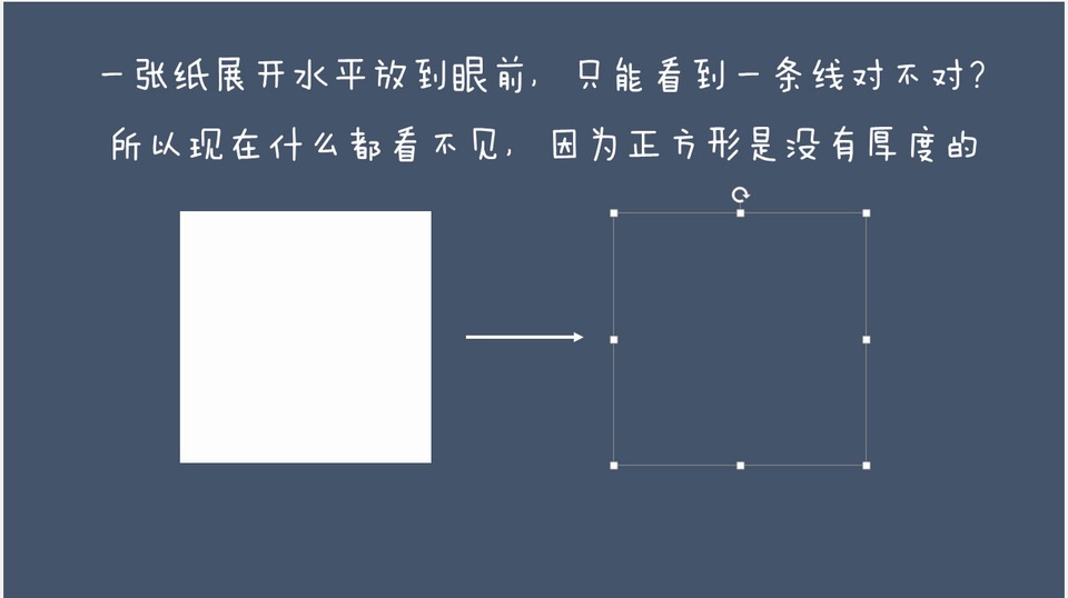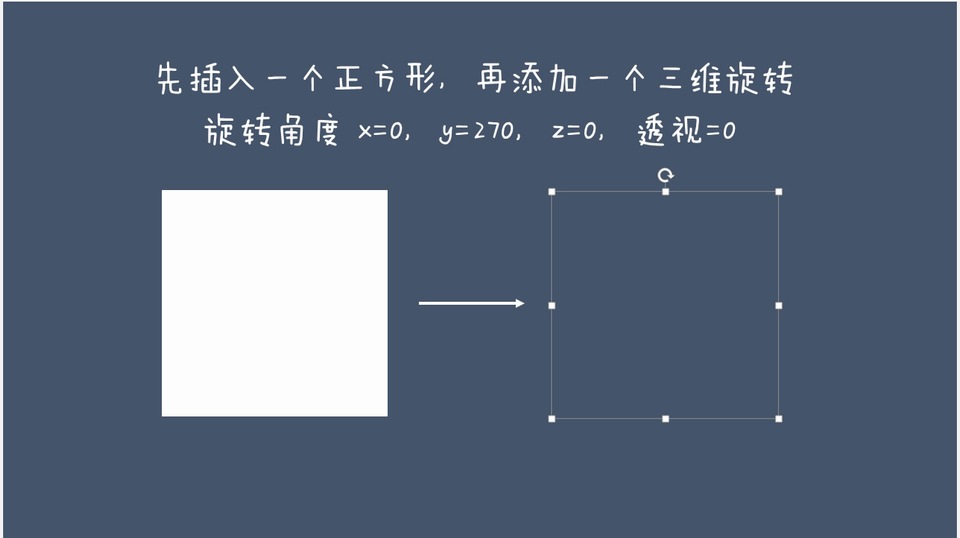 :喵星人说地球人根本不会用3D,之二by@般若黑洞,昨天铲屎官问朕,层级金字塔能不能也用3D搞定呐?这个问题引起了朕的美好回忆,所以朕打算打发慈悲地从原理说起,先插入一个正方形,再添加一个三维旋转,旋转角度 x=0,y=270,z=0,透视=0。