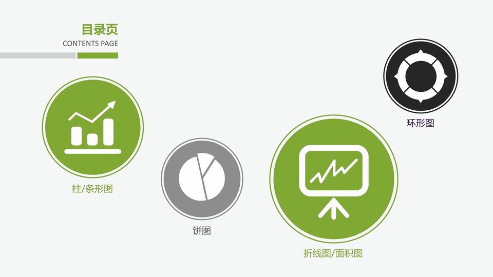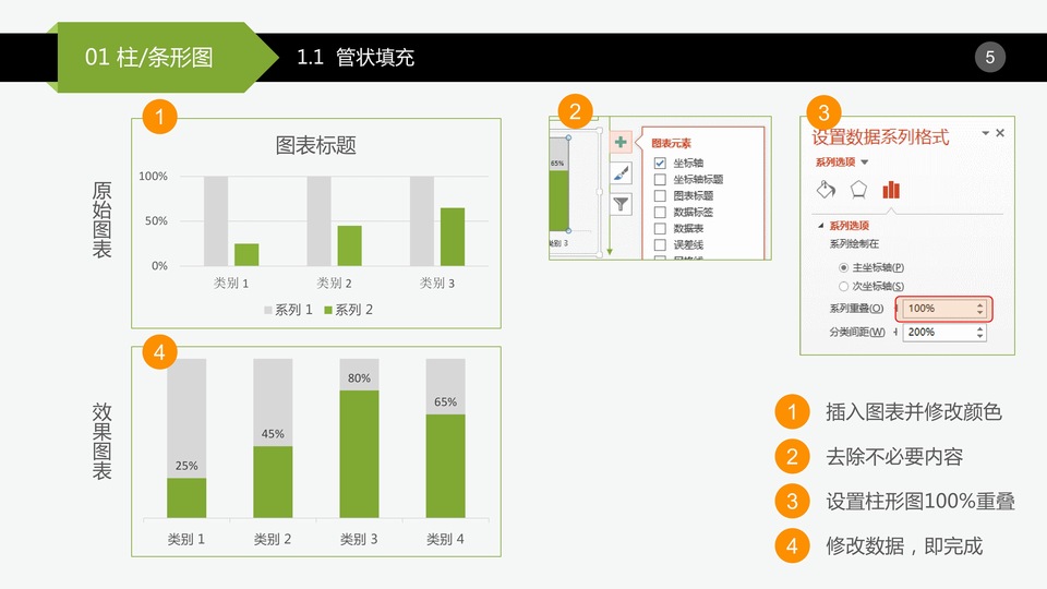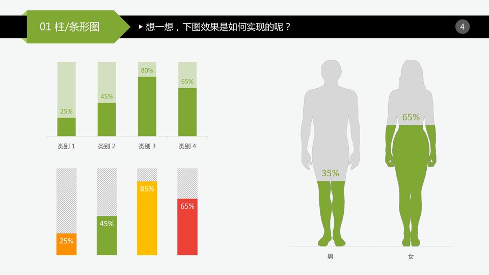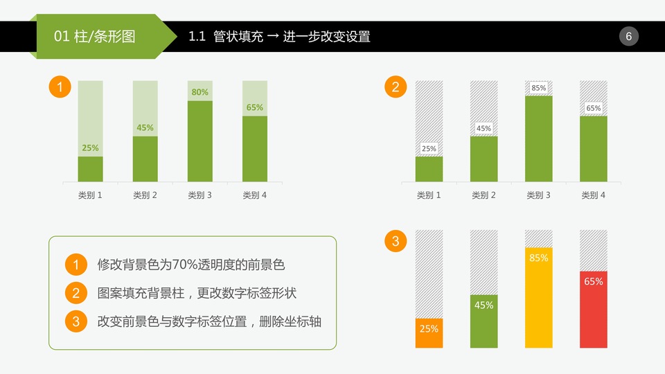 :柱/条形图,饼图,折线图/面积图,环形图▶ 想一想,下图效果是如何实现的呢?1.1 管状填充 → 进一步改变设置;1.2 图案填充;1.2 图案填充 → 其他应用;1.3 巧用堆积柱形图,02 饼图。