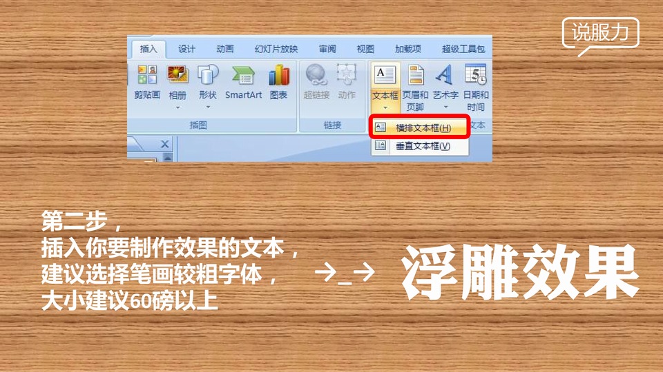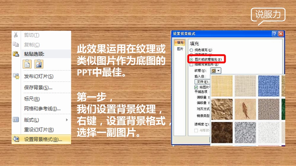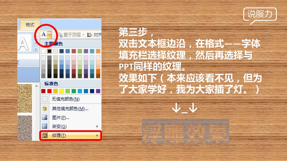 :PPT制作浮雕效果文字,此效果运用在纹理或类似图片作为底图的PPT中最佳;第一步,我们设置背景纹理,右键,设置背景格式,选择一副图片;第二步,插入你要制作效果的文本,建议选择笔画较粗字体,大小建议60磅以上浮雕效果。