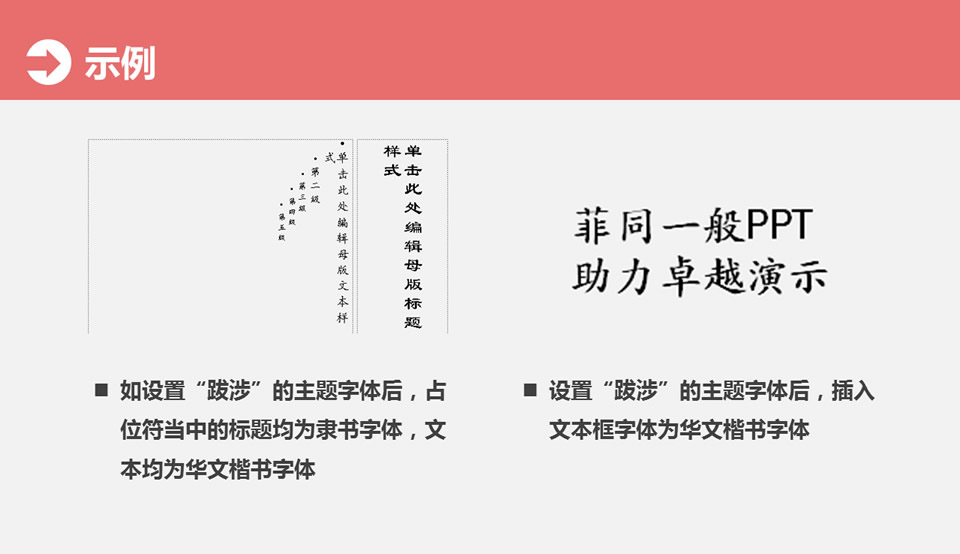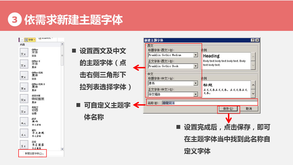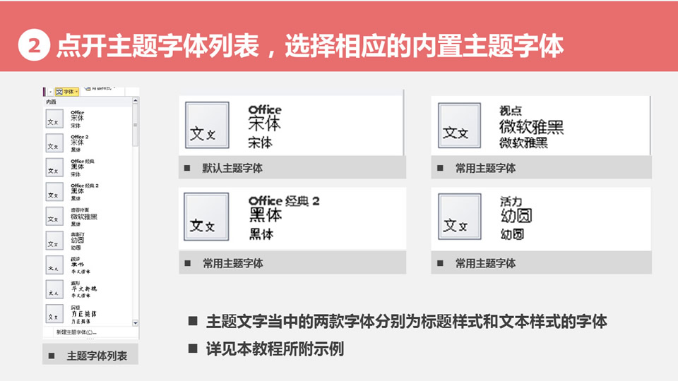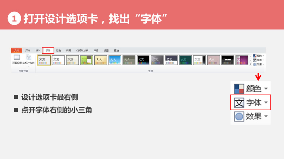:主题字体,打开设计选项开,找出“字体”,设计选项开最右侧,点开字体右侧的小三角,点开主题字体列表,选择相应的内置主题字,主题字当中的两款字体分别为标题样式和文本样式的字体,详见本教程所附示例。