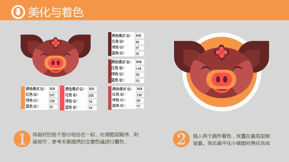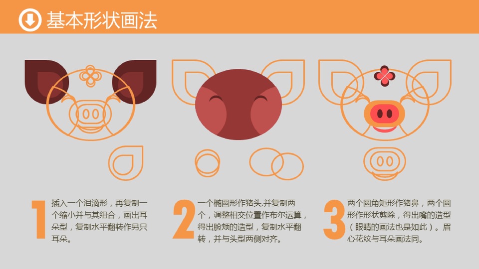 导读:基本形状画法,1、插入一个泪滴形,再复制一个缩小并与其组合,画出耳朵形,复制水平翻转作另只耳朵;2、一个椭圆形猪头,并复制两个,调整相交位置作布尔运算,得出两颊的造型,复制水平翻转,并与头型两侧对齐;3、两个圆角矩形作猪鼻,两个圆形作形状剪除,得出嘴的造型(眼睛的画法也是如此),眉心花纹与耳朵画法同。标签形状工具,手绘,动物猪