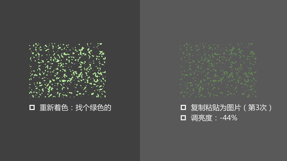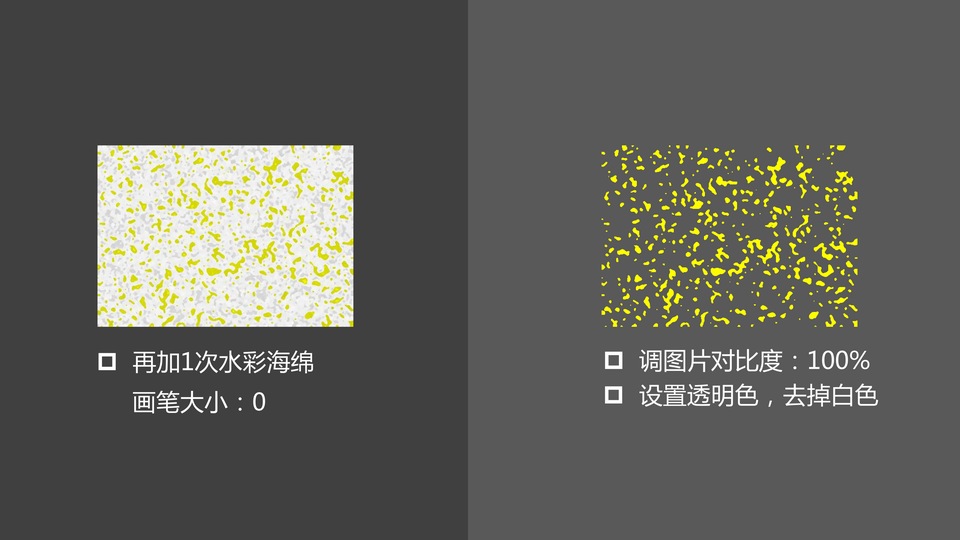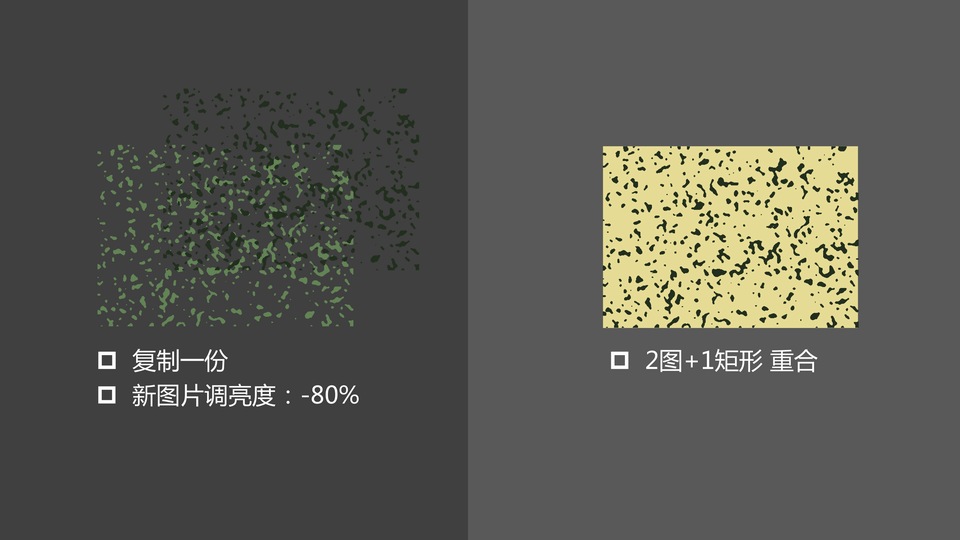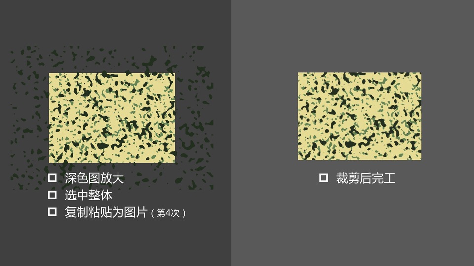 导读:形状:矩形,颜色:RGB(231,221,149),复制粘贴为图片(第1次),原矩形要保留,加艺术效果(水彩海绵),画笔大小:4,调图片对比度:100%,复制粘贴为图片(第2次),再加1次水彩海绵, 画笔大小:0,调图片对比度:100%,设置透明色,去掉白色,重新着色:找个绿色的,复制粘贴为图片(第3次),调亮度:-44%。标签迷彩图案,教程