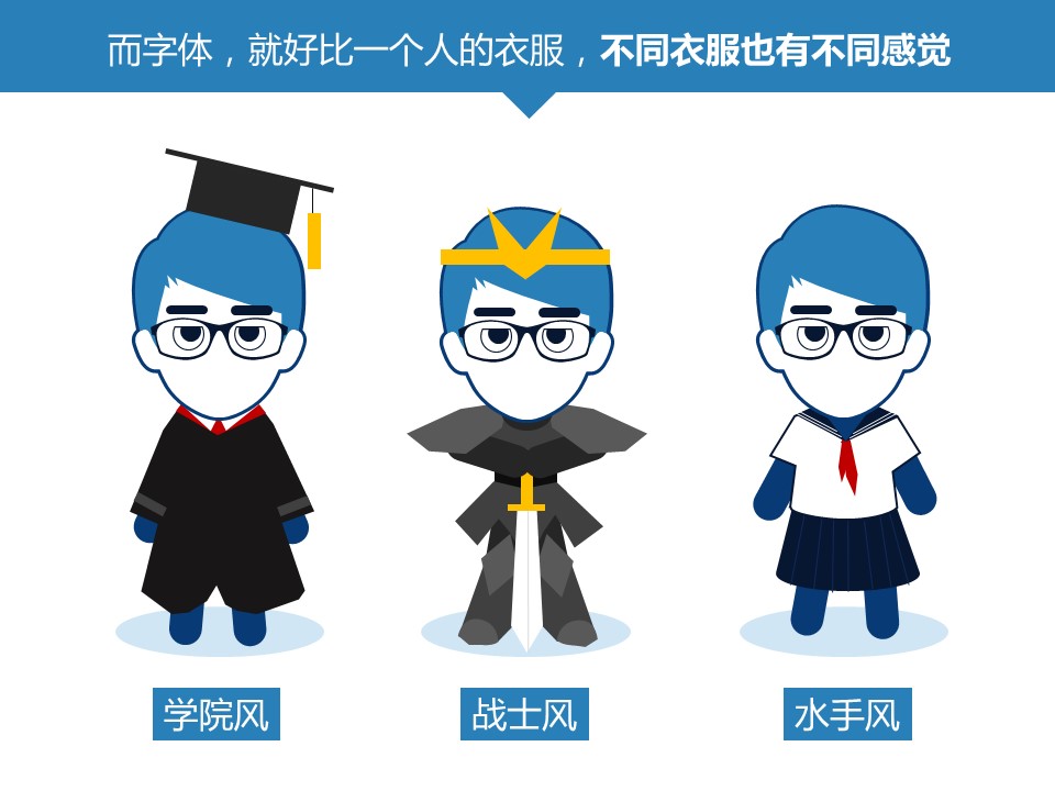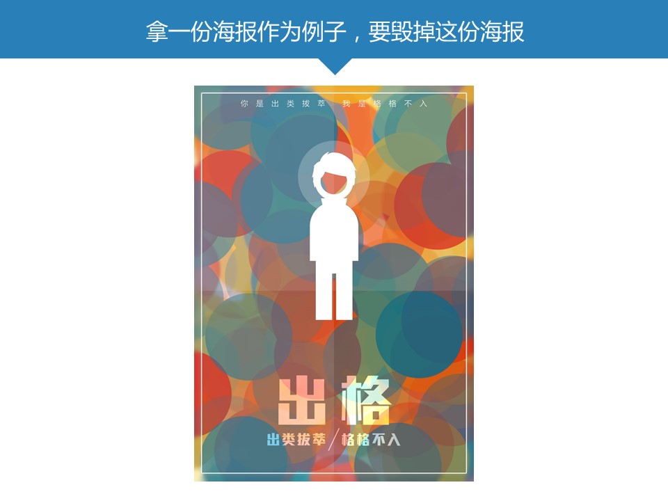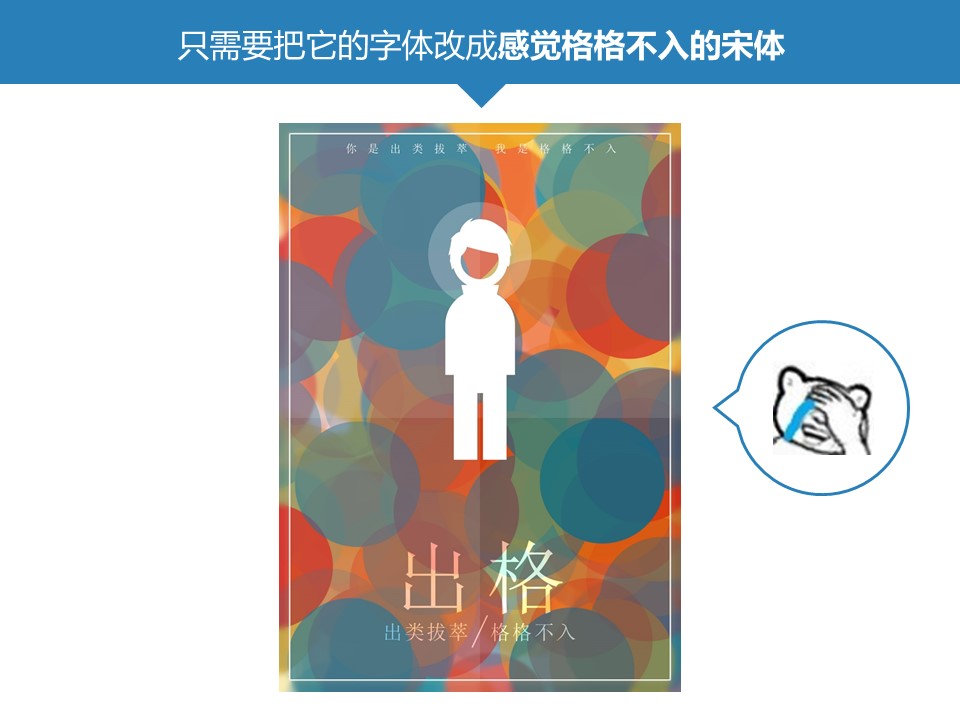 :对于ppt来说,文字内容就好比一个赤裸的肉体,而字体,就好比一个人的衣服,不同衣服也有不同感觉,那一份海报作为例子,要毁掉这份海报,只需要把它的字体改成感觉格格不入的宋体,要毁掉一页ppt也非常的简单。