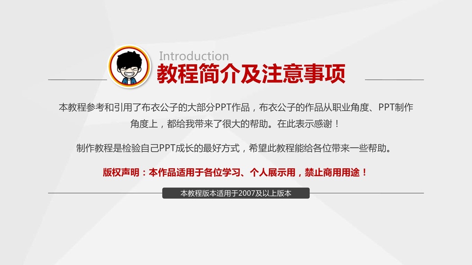 :教程简介及注意事项,本教程参考和引用了布衣公子的大部分PPT作品,布衣公子的作品从职业角度、PPT制作角度上,都给我带来了很大的帮助。在此表示感谢!制作教程是检验自己PPT成长的最好方式,希望此教程能给各位带来一些帮助。版权声明:本作品适用于各位学习、个人展示用,禁止商用用途!