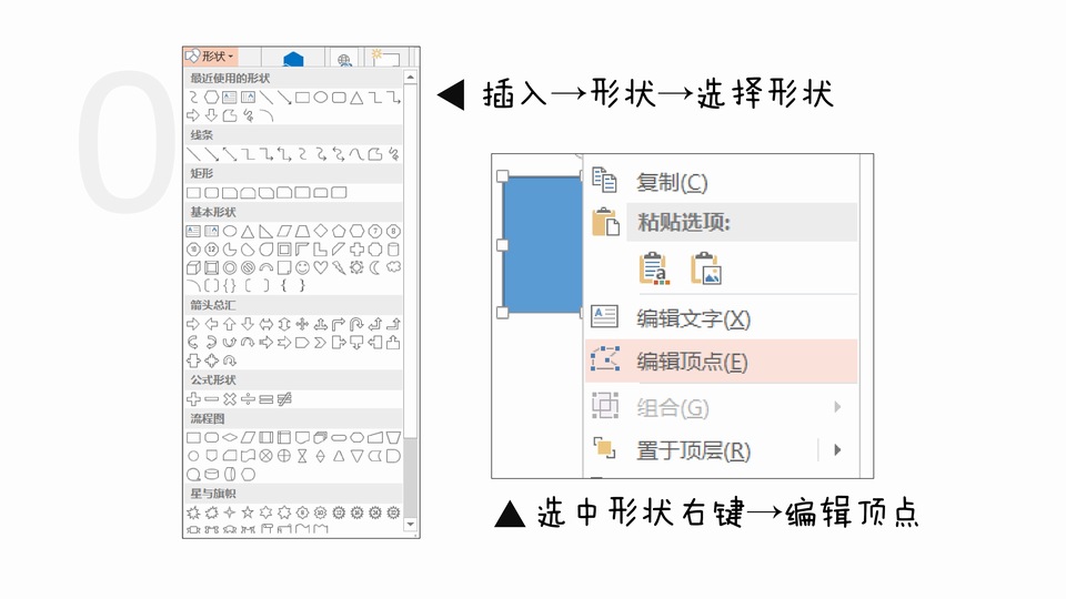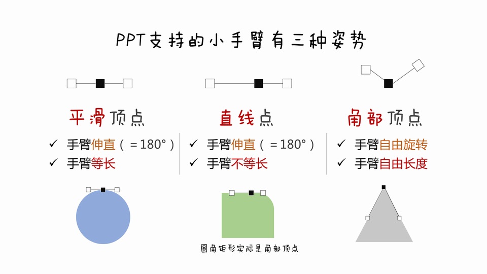:顶点篇,插入→形状→选择形状,选中形状右键→编辑顶点,每一个形状都有2个以上的顶点小伙伴,每一个顶点都有一对可爱的小手臂,PPT支持的小手臂有三种姿势,平滑顶点,手臂伸直(=180°),手臂等长。