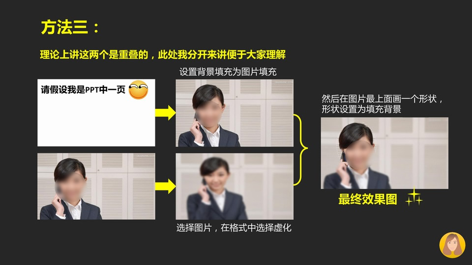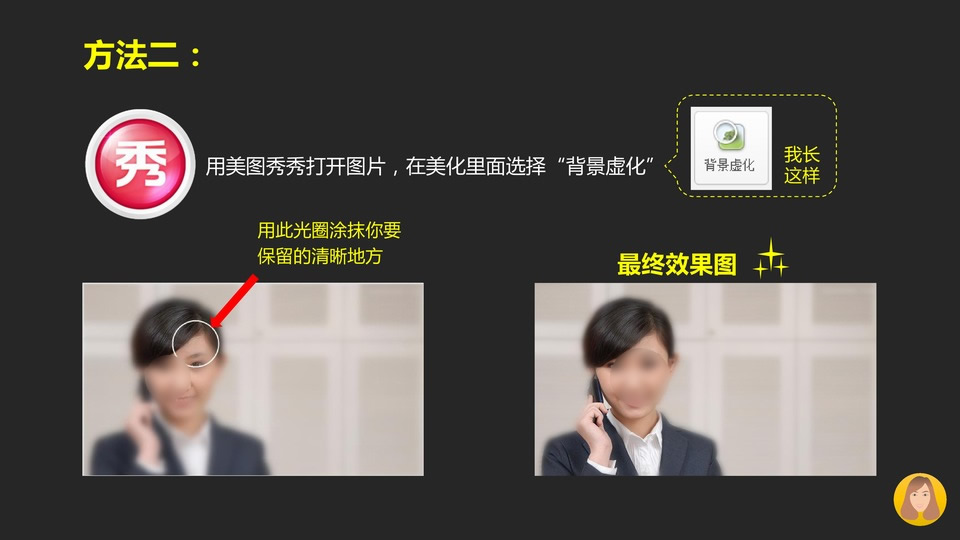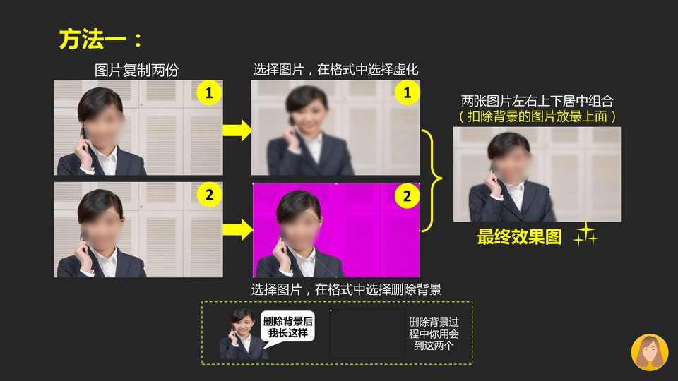 :局部虚化,方法一:图片复制两份,选择图片,在格式中选择虚化,选择图片,在格式中选择删除背景,两张图片左右上下居中组合,(扣除背景的图片放最上面),最终效果图。