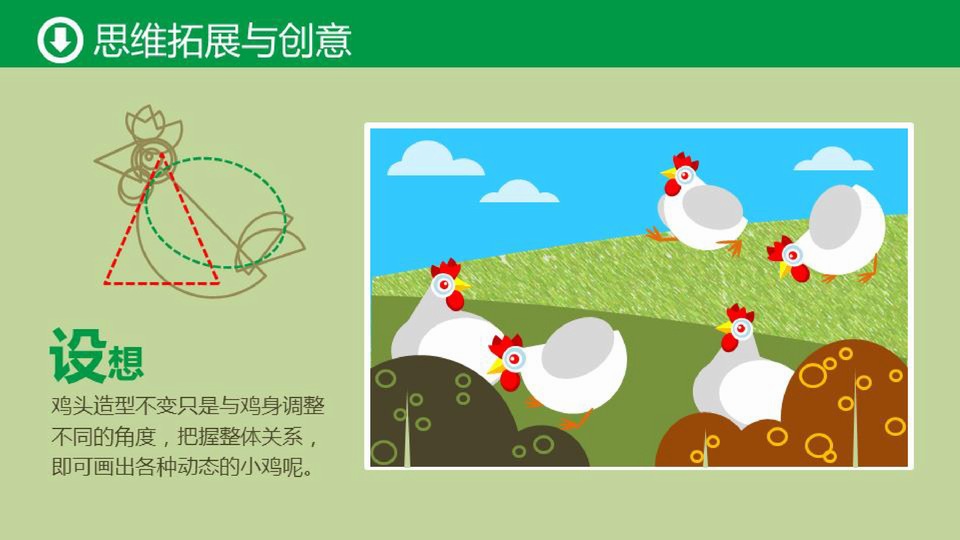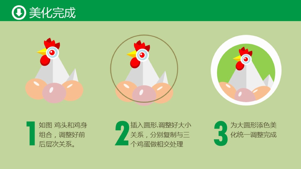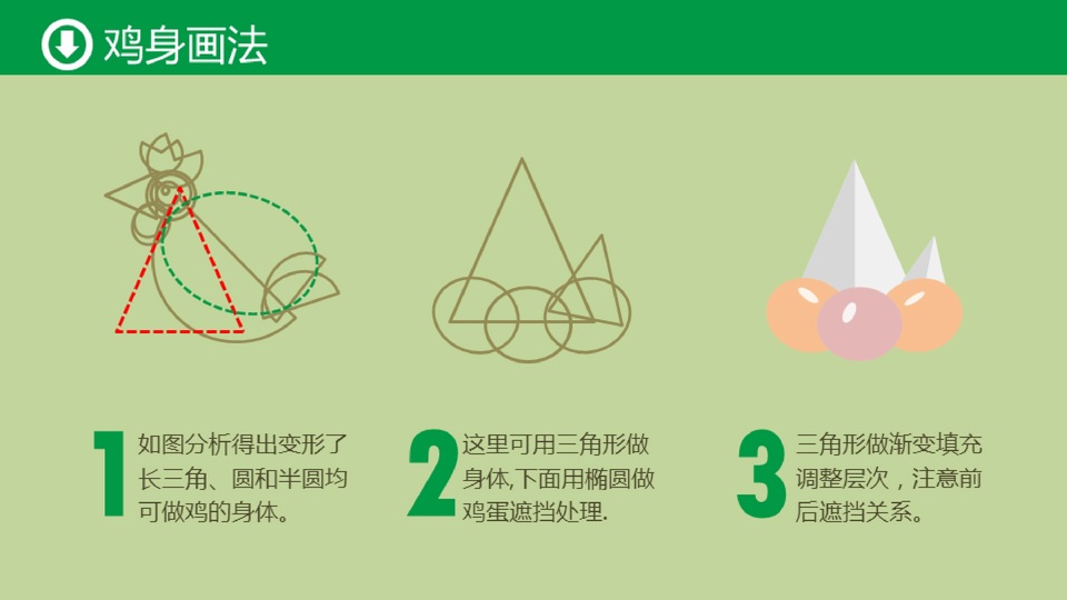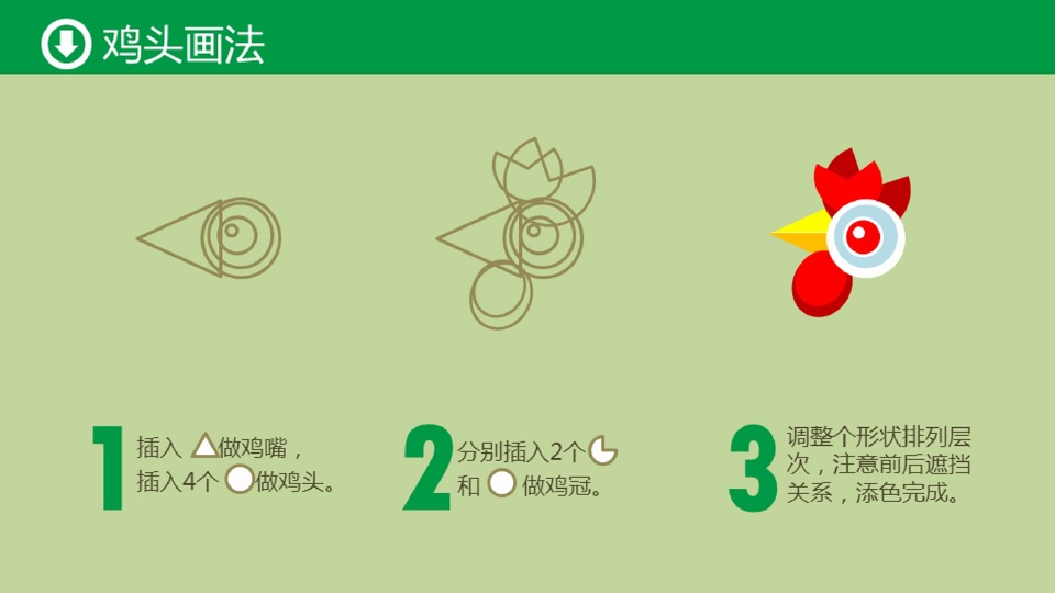 :形状手绘动物(鸡),鸡头画法,1、插入三角形做鸡嘴,插入4个圆形做鸡头,2、分别插入两个形状做鸡冠,3、调整个形状排列层次,注意前后遮挡关系,添色完成。
