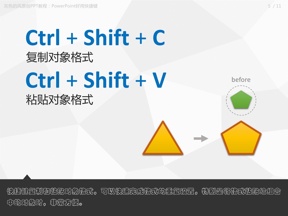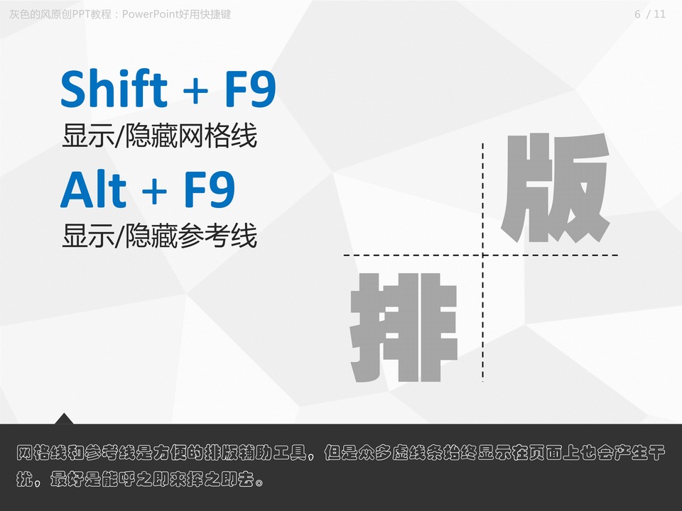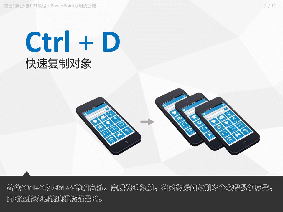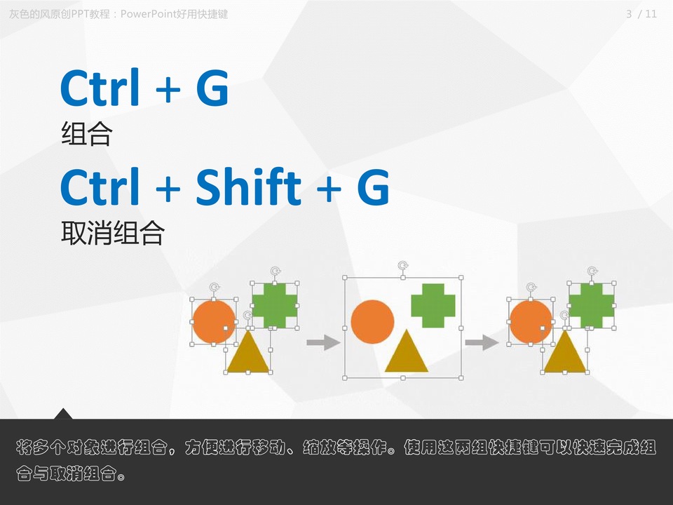 :PowerPoint好用“快捷键”附PowerPoint快捷键大全,Ctrl + D快速复制对象,替代Ctrl+C和Ctrl+V的组合键,完成快速复制,将对象瞬间复制多个变得易如反掌,同时还能实现快速排版效果哟。Ctrl + G组合,Ctrl + Shift + G取消组合,将多个对象进行组合,方便进行移动、缩放等操作。使用这两组快捷键可以快速完成组合与取消组合。