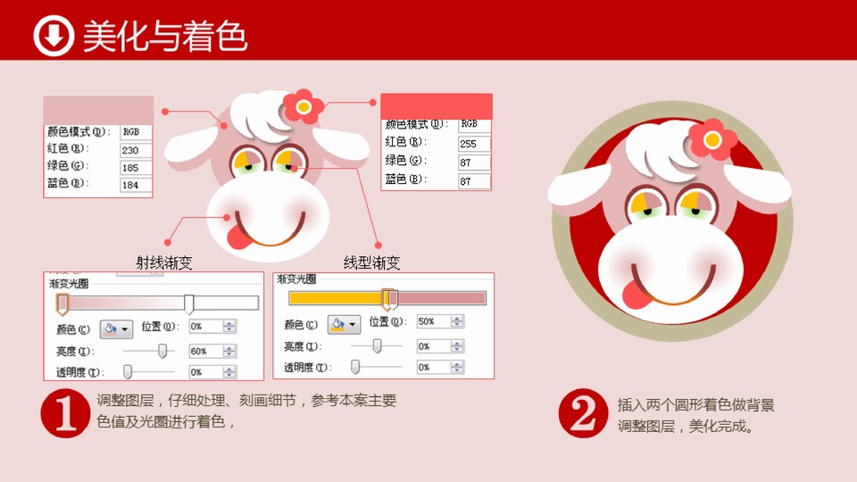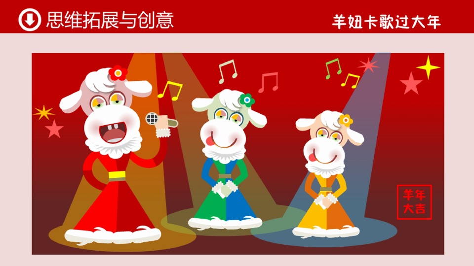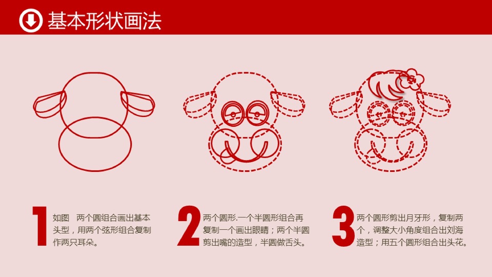 :形状手绘动物(羊),陈华创意出品,基本形状画法,1、如图,两个圆组合画出基本头型,用两个弦形组合复制作两只耳朵;2、两个圆形,一个半圆形组合再复制一个画出眼睛,两个半圆剪出的造型,半圆做舌头。
