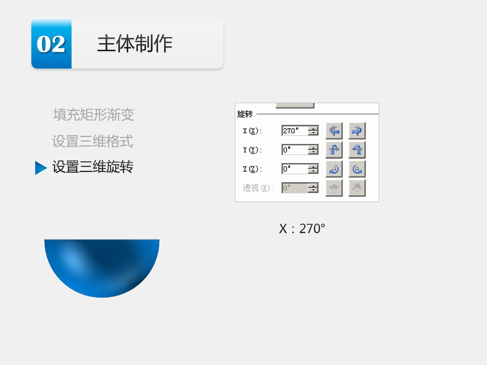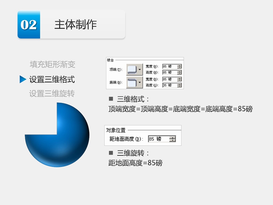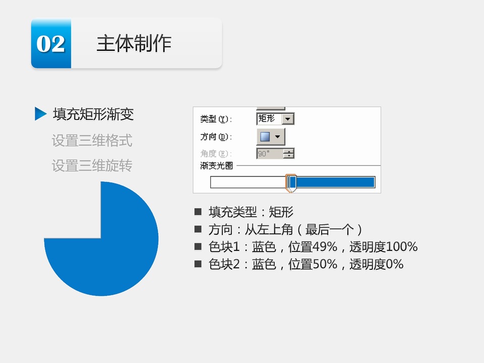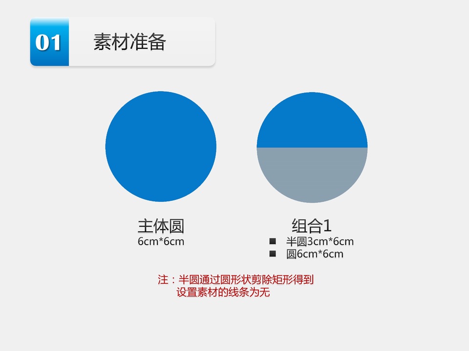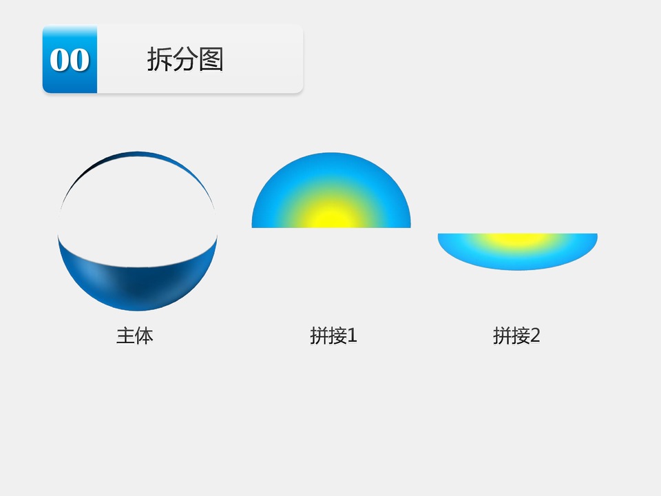 :矩形渐变在PPT 3D中的妙用,拆分图,主体,拼接1,拼接2,素材准备,主体圆,6cm*6cm,组合1,半圆3cm*6cm,圆6cm*6cm,注:半圆通过圆形状剪除矩形得到,设置素材的线条为无。