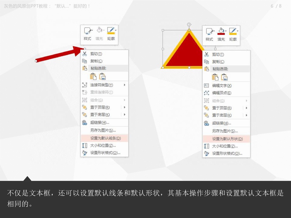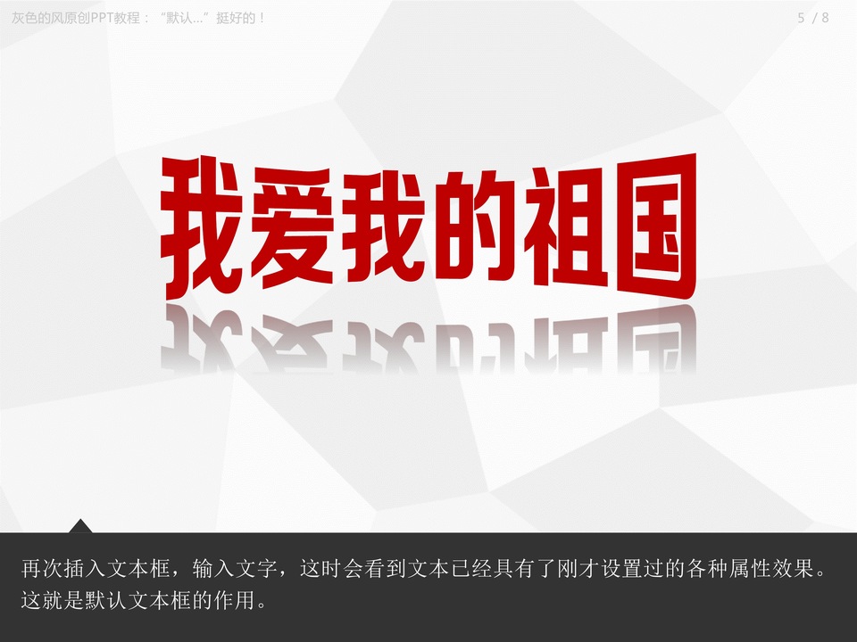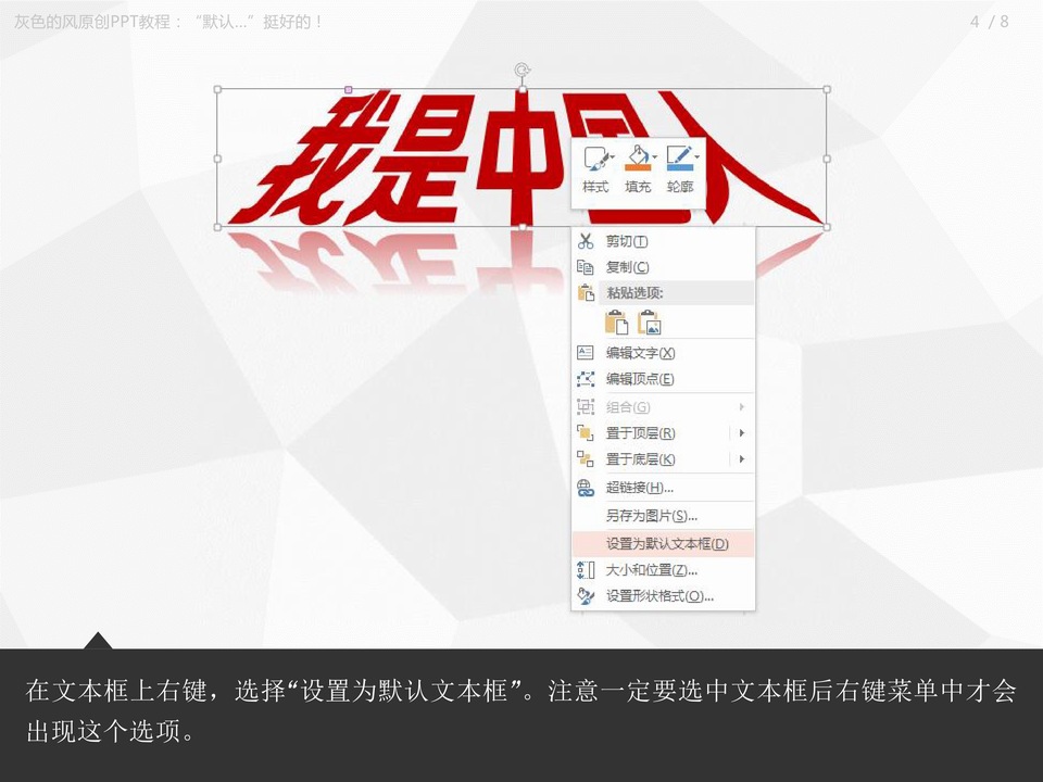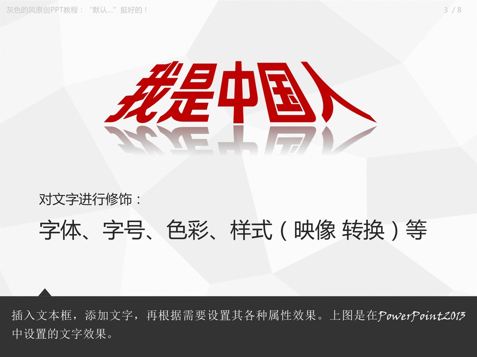 :“默认…”挺好的!能够简化操作、提高效率的PPT制作技巧都应该认真学习,对文字进行修饰:字体、字号、色彩、样式(映像 转换)等,插入文本框,添加文字,再根据需要设置其各种属性效果。上图是在PowerPoint2013中设置的文字效果。