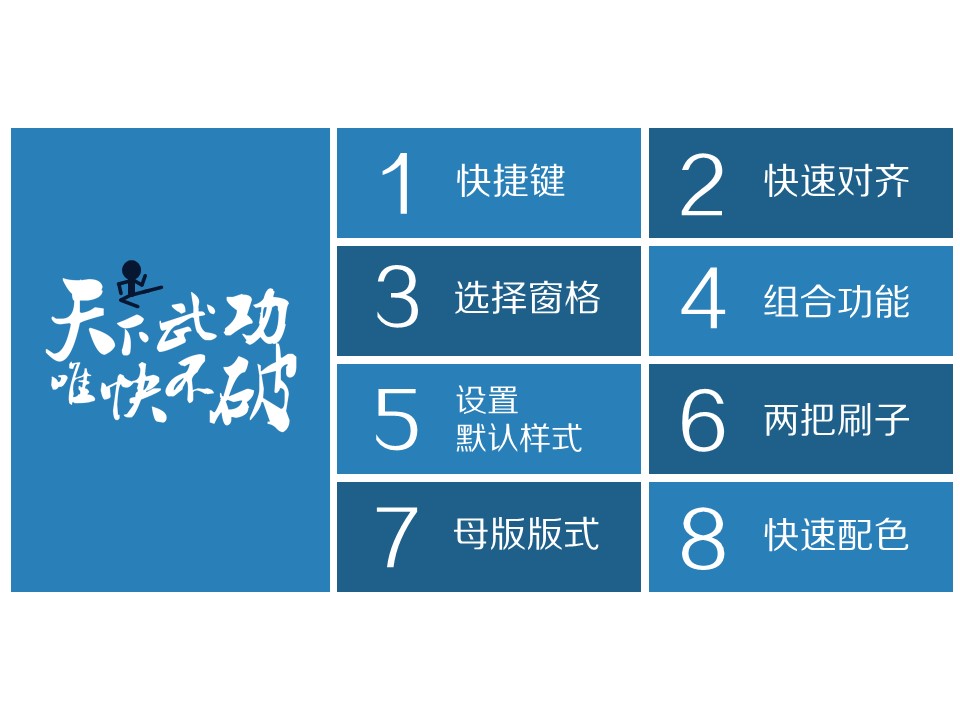 :天下武功,唯快不破,八个做PPT不加班的技巧,1、快捷键;2、快速对齐;3、选择窗格;4、组合功能;5、设置默认样式;6、两把刷子;7、母版版式;8、快速配色。