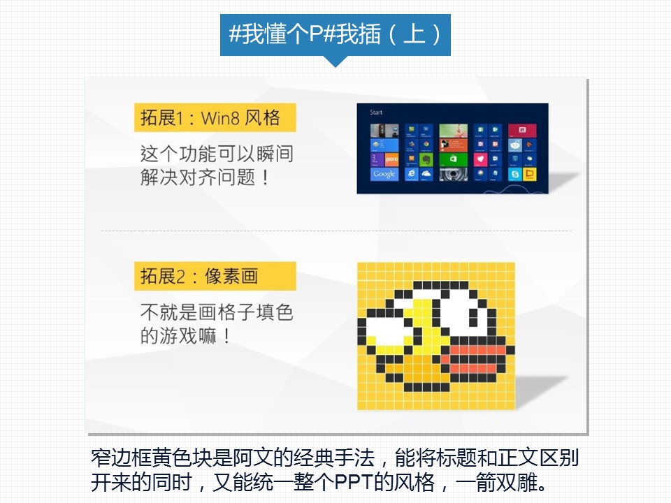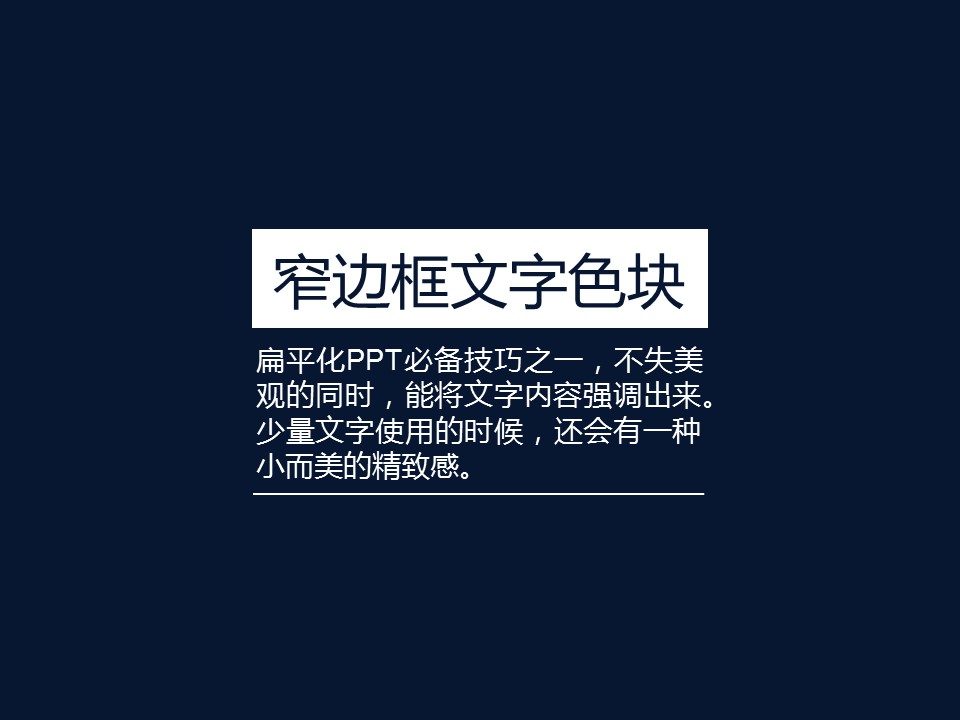 :扁平化风格手册:色块篇(下),漫画风最暴力无尿点PPT系列教程,壹文钱ppt教程,这样用色块才会高大上,窄边框文字色块,扁平化ppt必备技巧之一,不失美观的同时,能将文字内容强调出来,少量文字使用的时候,还会有一种小而美的精致感。