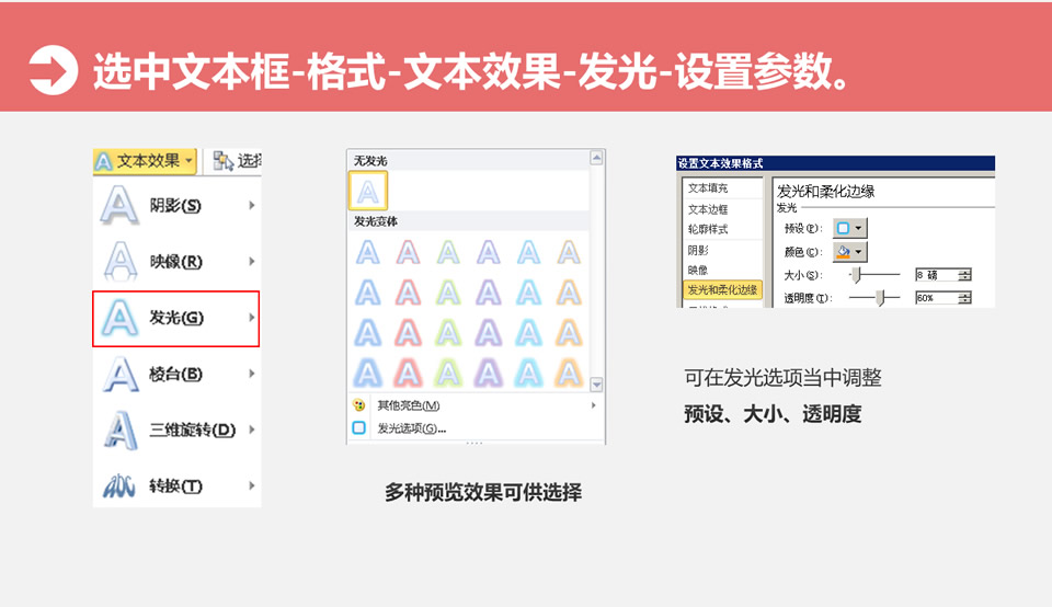 :文字发光设置,选中文本框——格式——文本效果——发光——设置参数。