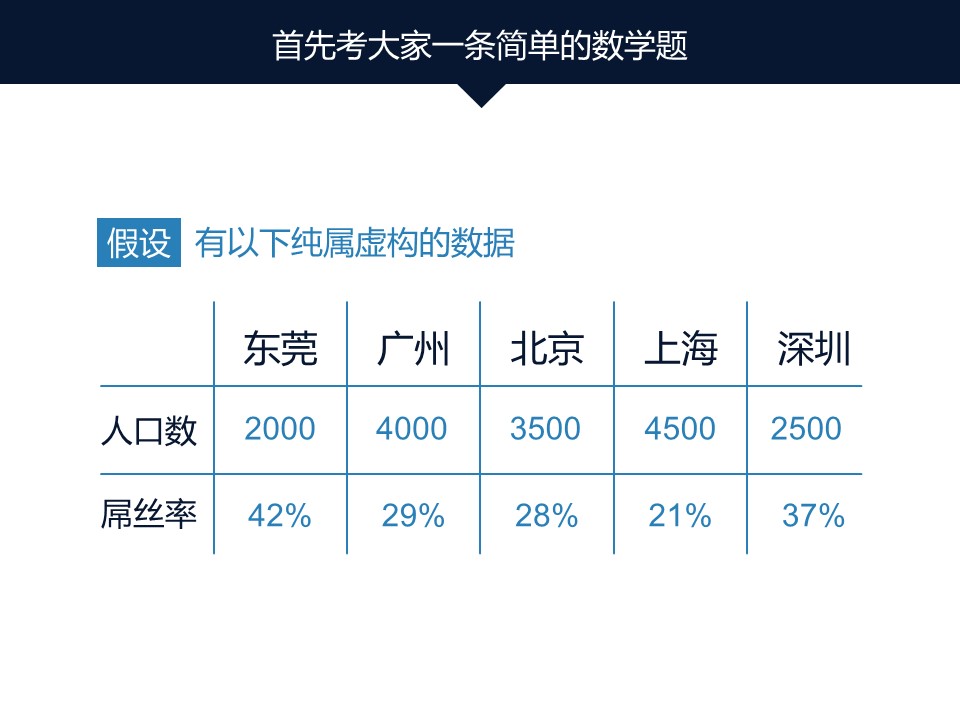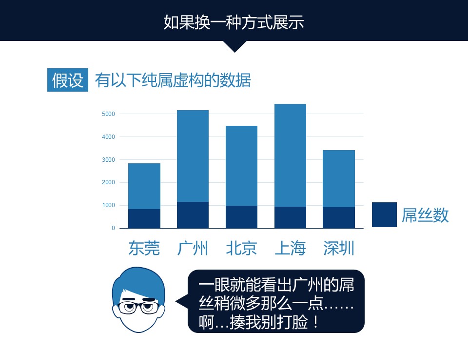 :首先考大家一条简单的数学题,假设:有以下存属虚构的数据,问题,你能一眼就看出那个城市的屌丝多?至少我不能,如果换一种方式展示,假设:有以下纯属虚构的数据。