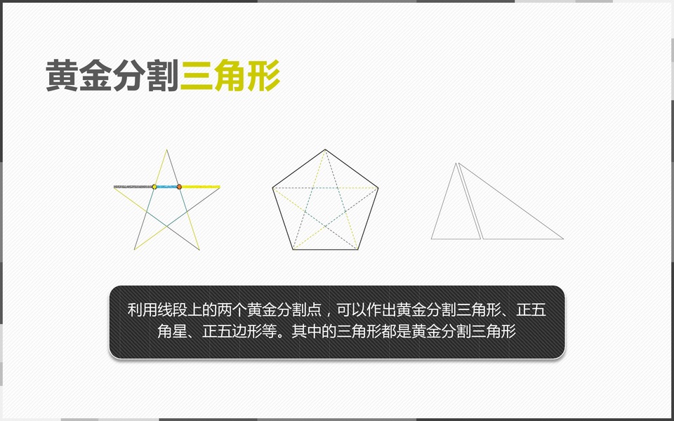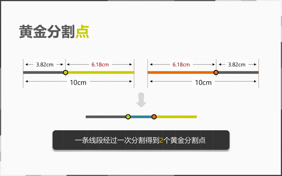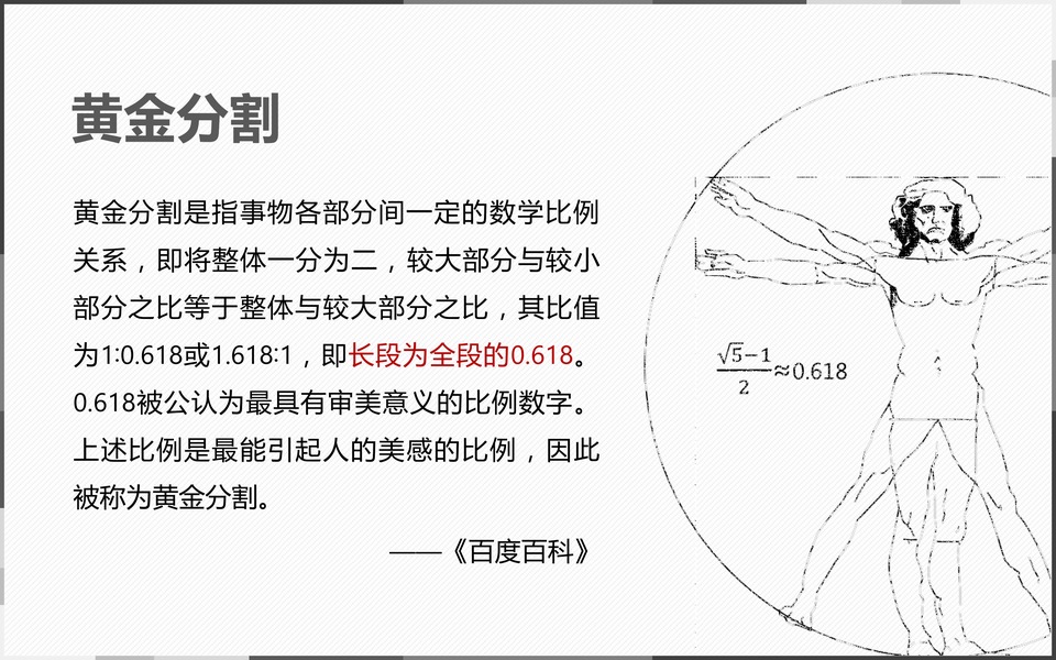 :黄金分割在ppt设计中的运用,基础知识篇,黄金分割是指事物各部分间一定的数学比例关系,即将整体一分为二,较大部分与较小部分之比等于整体与较大部分之比,其比值为1∶0.618或1.618∶1,即长段为全段的0.618。0.618被公认为最具有审美意义的比例数字。上述比例是最能引起人的美感的比例,因此被称为黄金分割。