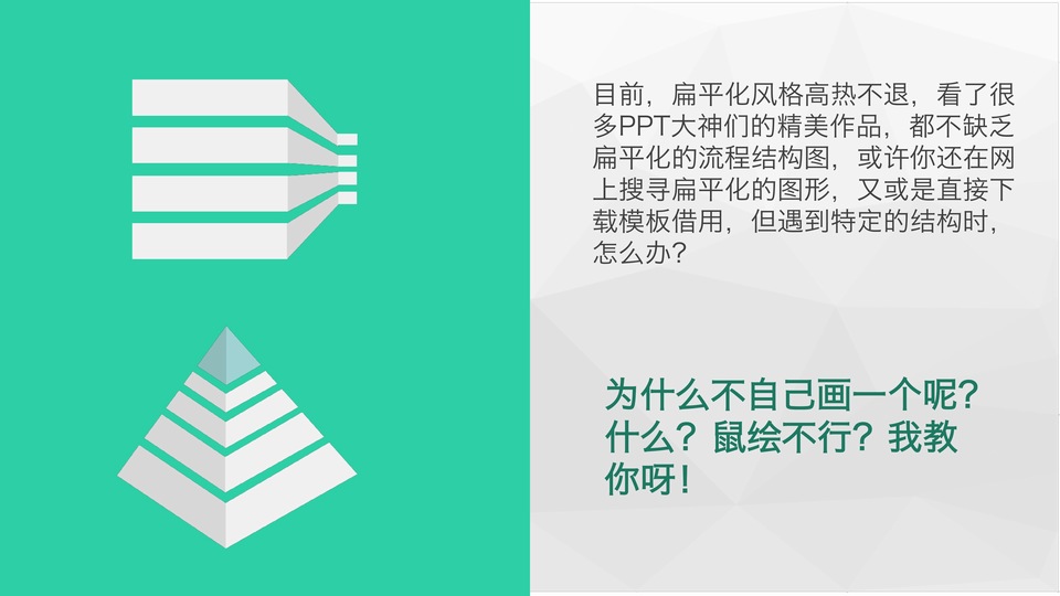 :扁平化结构图的画法,目前,扁平化风格高热不退,看了很多PPT大神们的精美作品,都不缺乏扁平化的流程结构图,或许你还在网上搜寻扁平化的图形,又或是直接下载模板借用,但遇到特定的结构时,怎么办?为什么不自己画一个呢?什么?鼠绘不行?我教你呀。